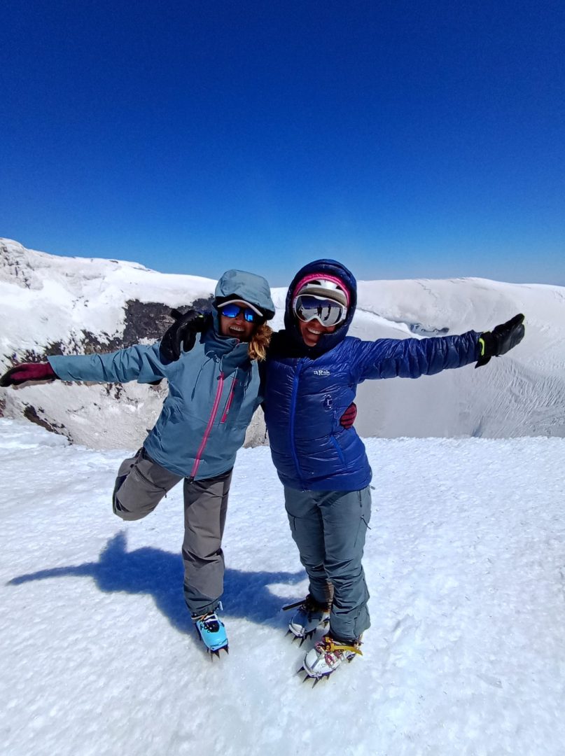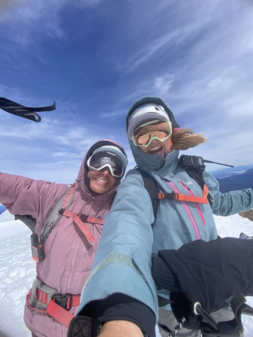 El viento casi me botaba a cada instante pero permanecí varios segundos así de pie sin moverme. Llegó Georgette y subimos los últimos 2 metros para llegar a la cumbre real. El viento era terrible, nos abrazamos y nos refugiamos bajo una roca cubierta de hielo donde pudimos sentarnos, comer e hidratarnos. Después de unos 30 minutos, antes de sentir demasiado frío, nos dirigimos a la cumbre para hacer el material audiovisual y nos equipamos para descender. El viento no nos daba tregua. Esquiamos las dos desde la cumbre y fue maravilloso. Nuevamente nos tocaban condiciones de nieve ideales.