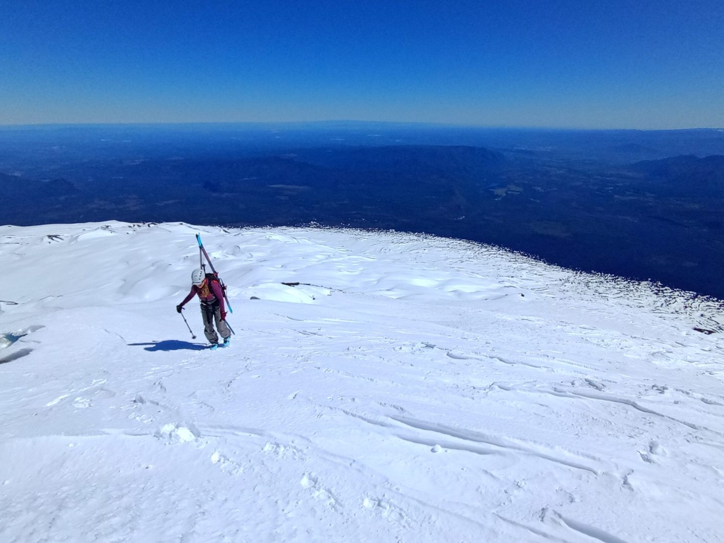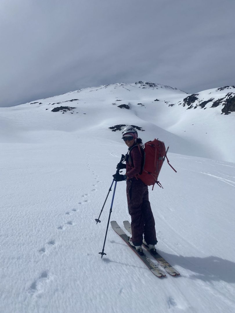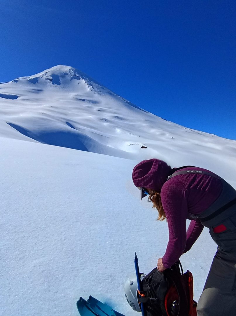 En las primeras laderas empinadas del volcán, Georgette paró para sacarse los esquíes y ponerse los crampones. Decidí seguir subiendo, sin perderla de vista. Empecé a subir sola, a mi ritmo escuchando mi respiración. Logré conectarme conmigo misma, con mi propósito, con mi cuerpo y mi presencia. Me sentí bien y supe que este ascenso iba a ser maravilloso.