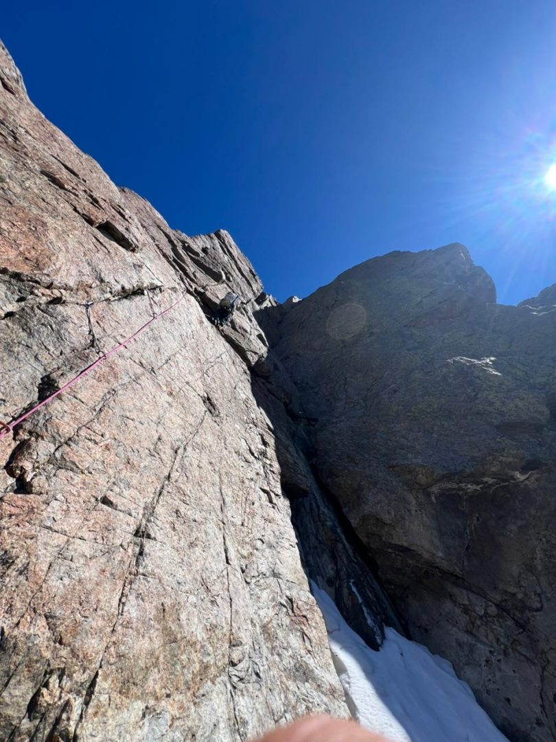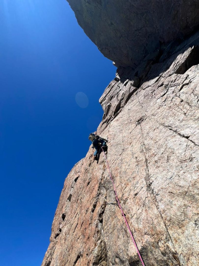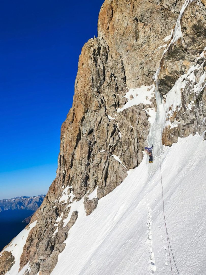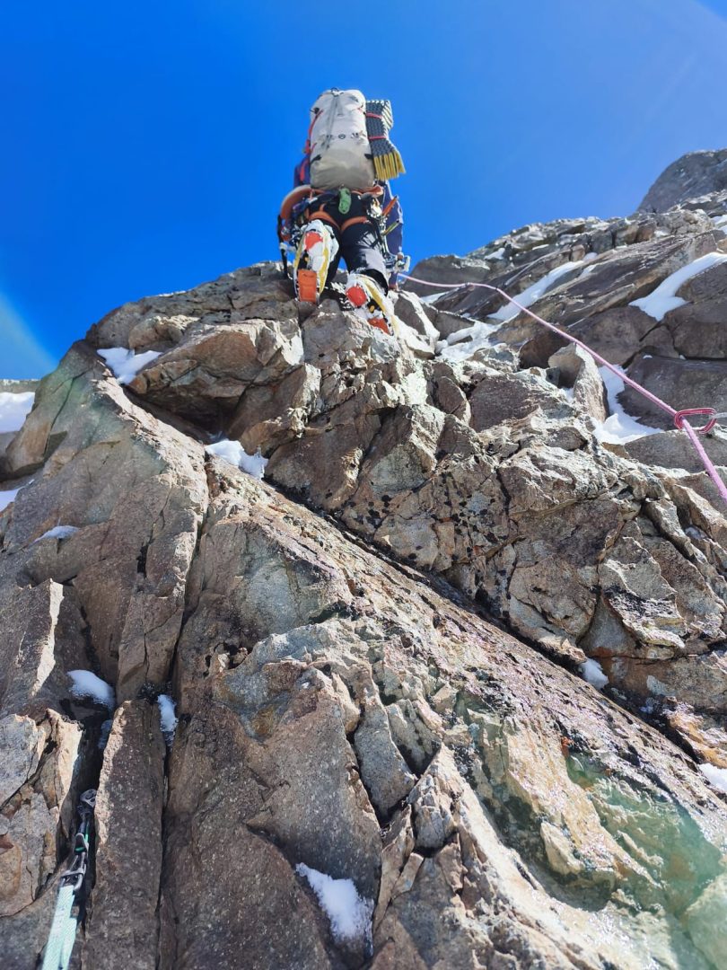 Yo te diría que los largos crux, lo más difícil fue una seguidilla de largos mixtos que eran verticales, técnicos y el problema principal era que había una nieve azúcar sobre el granito, entonces había que limpiar. Además, la protección era con clavos, con pitones planos, lo que lo hacía bien psicológico, con mucho run-out (distancia entre seguro y seguro).