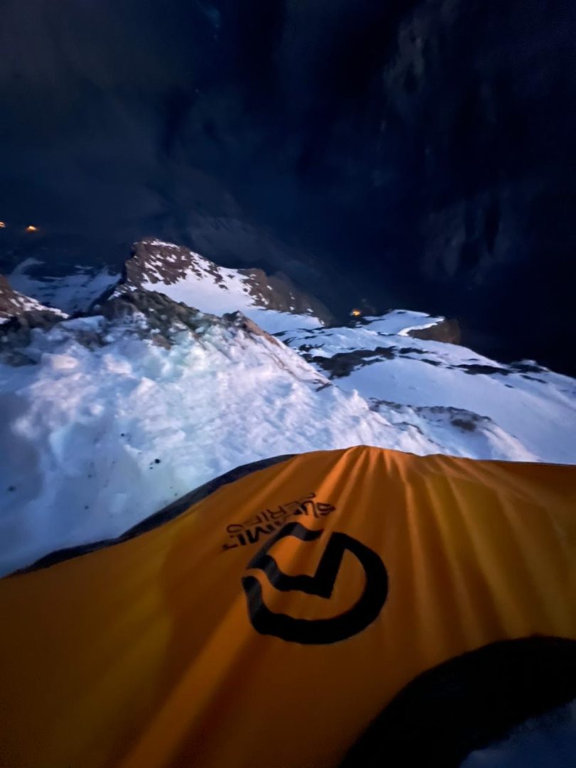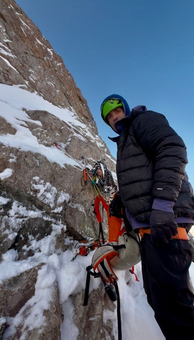 La parte alta era la incertidumbre máxima porque era muy grande, muchas paredes, muchas opciones y fue como “bueno, al menos la parte baja y media la tenemos más o menos clara y la parte más alta será la incertidumbre máxima”. Resultó que le entramos súper bien a la línea, empezamos escalando con zapatillas de escalada: largos de diedro, de roca roja de gran calidad y después conectamos unos neveros, luego unos largos mixtos y después llegamos al primer vivac que fue una terraza bien aérea antes de una cascada de hielo que decidimos escalarla a primera hora del día siguiente por las condiciones.