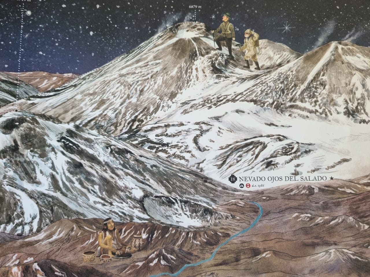 Cox: No. No sólo los andinistas. Toda la ciudadanía debería tener el libro. Todo chileno y chilena. Porque es nuestro patrimonio, porque nos define, porque está ahí aunque seamos mezquino con ella, nuestra cordillera. Los andinistas, que ya son amantes de los Andes por definición, van a maravillarse con otra representación de esas montañas y esa cordillera que tanto los inspira. La gracia que sea un ilustración es que da permiso para jugar y romper reglas. Nunca existirá un libro de toda la cordillera de los Andes, porque sería como el tren instantáneo de Parra o el mapa en el cuento “El rigor de la Ciencia” de Borges : imposible, un sinsentido o quimérico. En esta miniatura, larga, evocamos esa inmensidad, con mucha humildad, porque los Andes son muy grandes y hermosos, pero algo invoca de lo que es realmente la cordillera completa, que es inconmensurable. No cabe en un lente ni en mil fotografías, pero en una ilustración podemos jugar a que sí, un poco. Y con un ilustrador como Sebastián, hemos descubierto que con mayor razón.