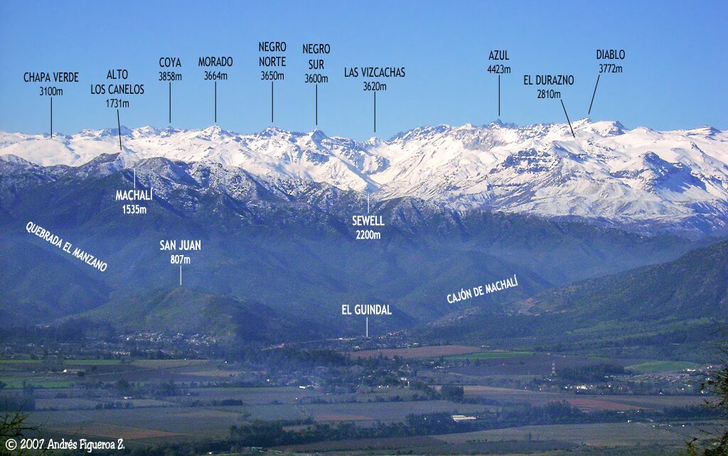 El cerro Lomas Bayas de 3.363 metros se encuentra en el sector de Sewel y su nombre hace referencia a la forma achatada de su cumbre con presencia de terreno color blanco amarillento.