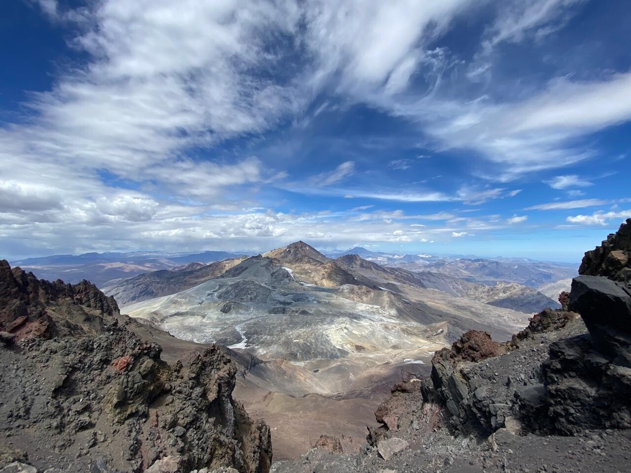 Salimos desde lagunas de Teno con mochilas y atravesamos la ribera oriental de la laguna durante 1 h 40 min para acampar a 2.700 msnm. En ese tramo hay varios esteros de agua que caen. Luego ya no hay más. Al día siguiente iniciamos el ascenso a las 7:30 am. Llegamos a la base del volcán a las 9:30 am aprox para iniciar el ascenso a la "pirámide" y los 1000 mts de desnivel de acarreo y roca por delante. Luego de un sector de rocas grandes y sueltas con tramos bastante aéreos, alcanzamos la cumbre a las 1.30 pm. Majestuosa vista al complejo Peteroa-Azufre, cerro Sosneado y Alto los Arrieros detrás de las lagunas de Teno. Escaso viento. Volvimos al auto a las 20 h aprox. Larga y extenuante jornada.