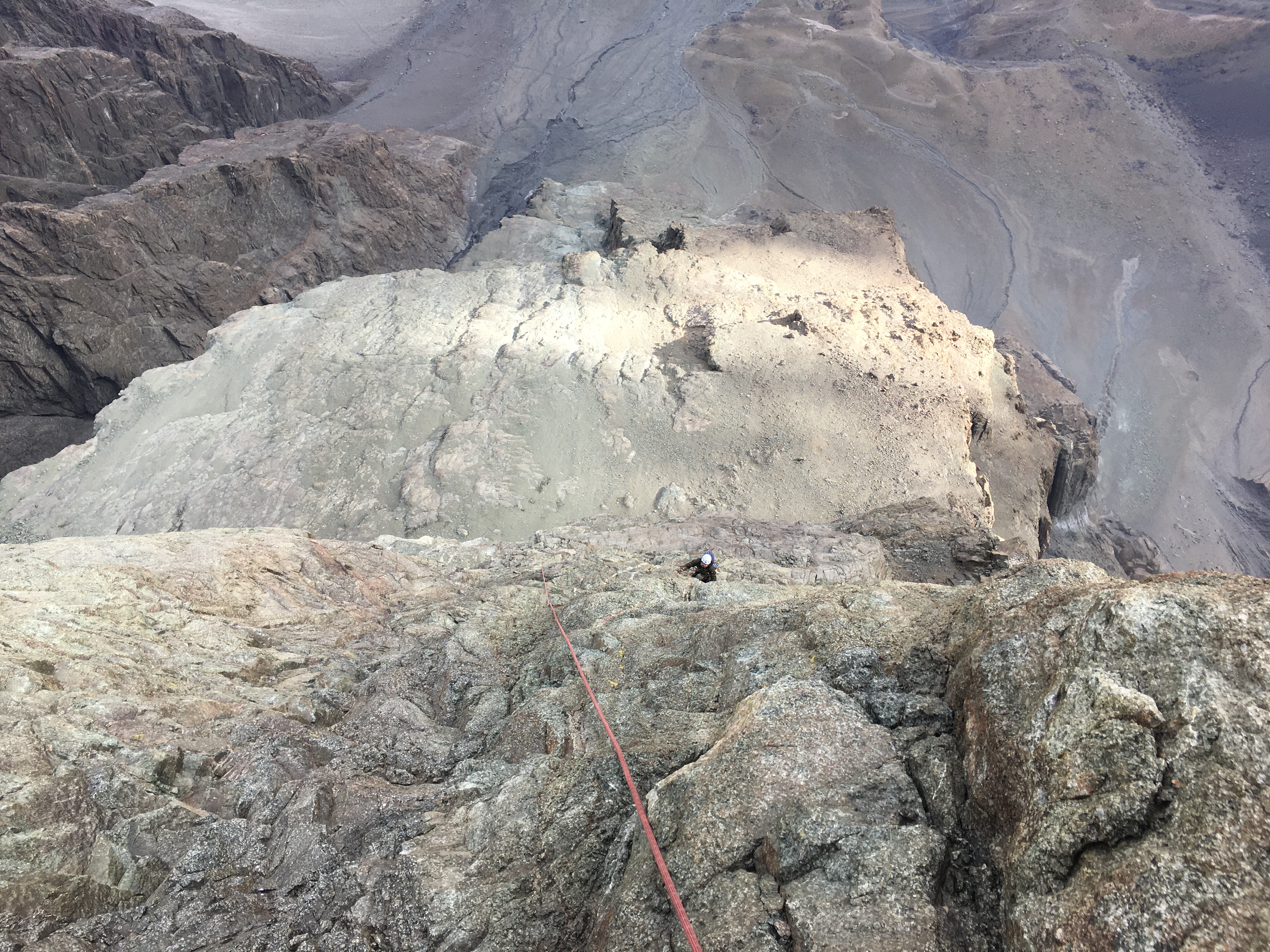 Vivaqueamos al pie del acarreo de la pared sur, saliendo 4.30 am y llegando a cumbre cerca de la 1 pm, bordeando pegado al farellon. Escalamos la cummbre real a pulso pero despues encontramos la caja cumbre en el lugar clásico de cumbre normal. Bajamos diecto al valle oeste y de ahí al vivaq, en un total de 12 hrs. Solo manchones de nieve dura, no necesario crampones.