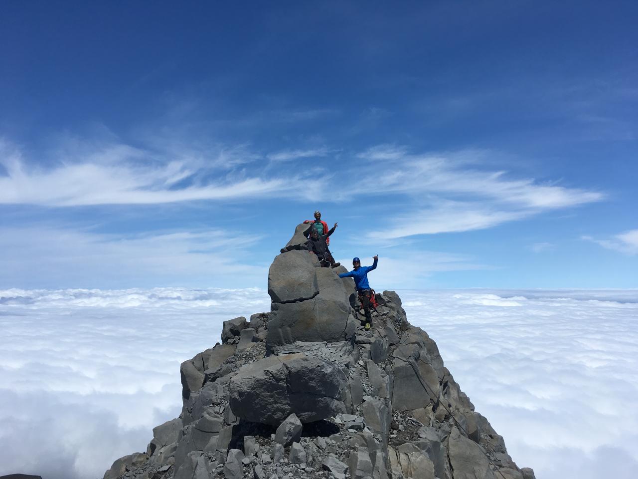Sendero en general bien marcado. Cuando se sale del bosque seguir traverseando hasta llegar al canalón que generalmente tiene nieve. Fue necesario crampones y piolet. El trepe cumbrero es fácil y se puede desescalar, nosotros quisimos hacer rappel para prácticar. Espectacular cumbre por sobre las nubes!