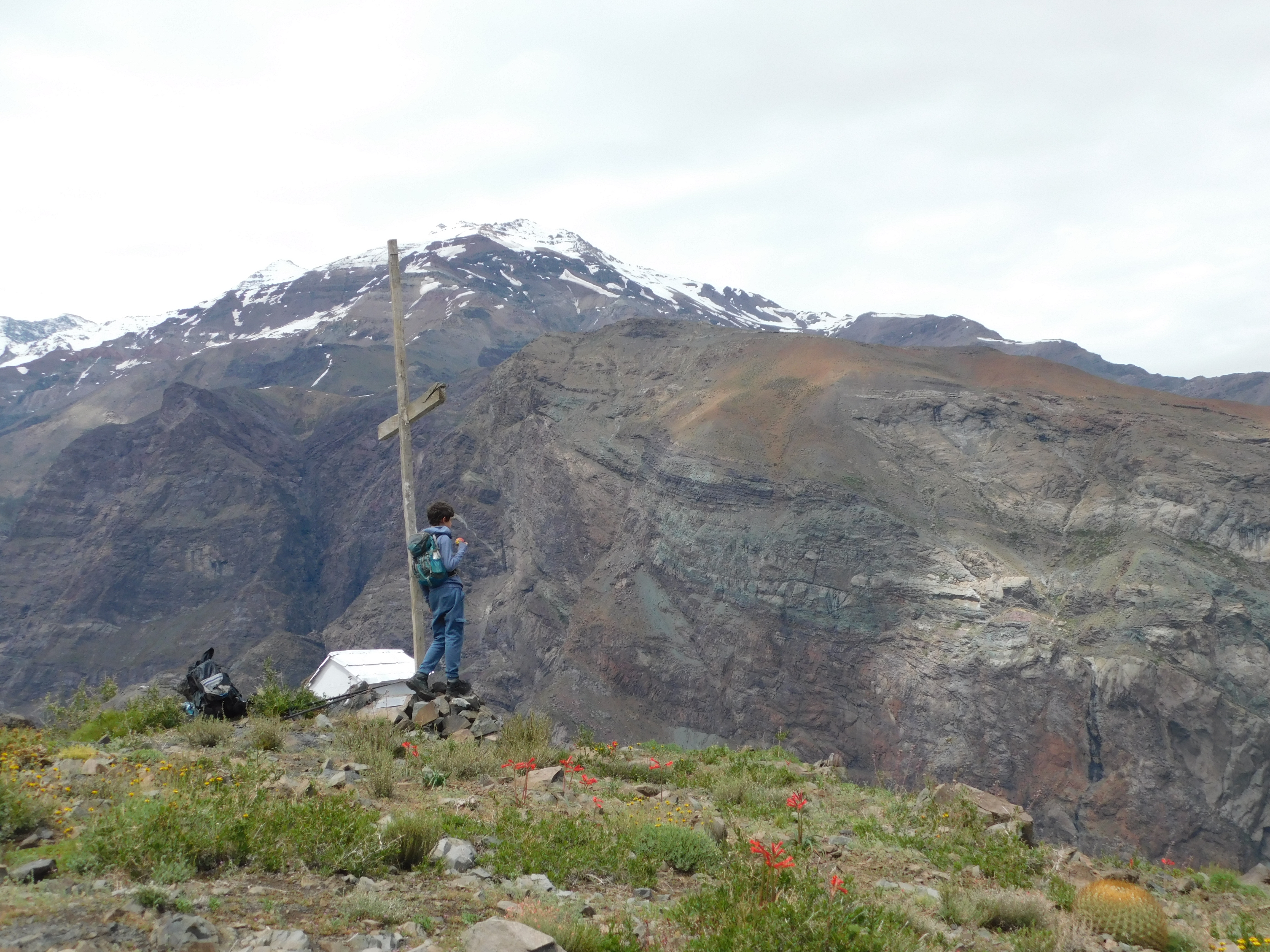 El sábado pasamos a alojar al refugio de Río Blanco. A pesar de que habían entrado a robar hacía poco, el refugio estaba en buenas condiciones, sólo faltaba gas, así que hicimos un asado. El domingo partimos a subir la cumbre que está detrás de la escuela de montaña. No estamos seguros de su nombre porque no aparece en las cartas, pero alguien nos dijo que se llama Cruz Oriente. El cerro está en terrenos del ejército y oficialmente no dejan pasar. A pesar de eso no tuvimos problemas y subimos por la ruta más directa que vimos. En la cumbre nos encontramos con la cruz que habíamos visto muchas veces desde lejos. El cerro tiene muy buenas vistas y se puede hacer en menos de 3h por lo que es una muy buena alternativa para hacer por el día.