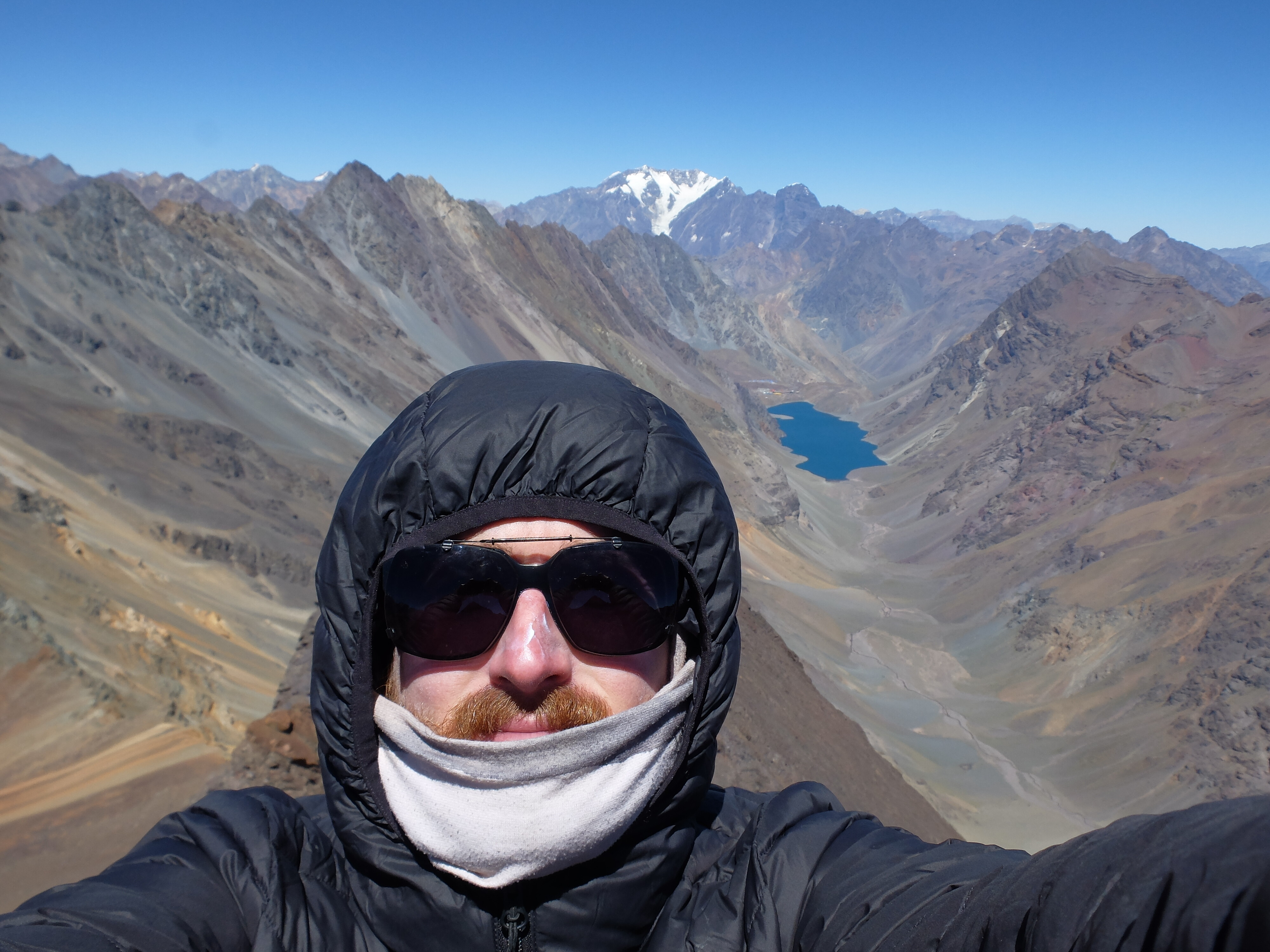 En la cumbre me han tocado vistas espectaculares sobre los valles de la laguna y de la quebrada de Matienzo llenos de color, con el espectacular Aconcagua al fundo.