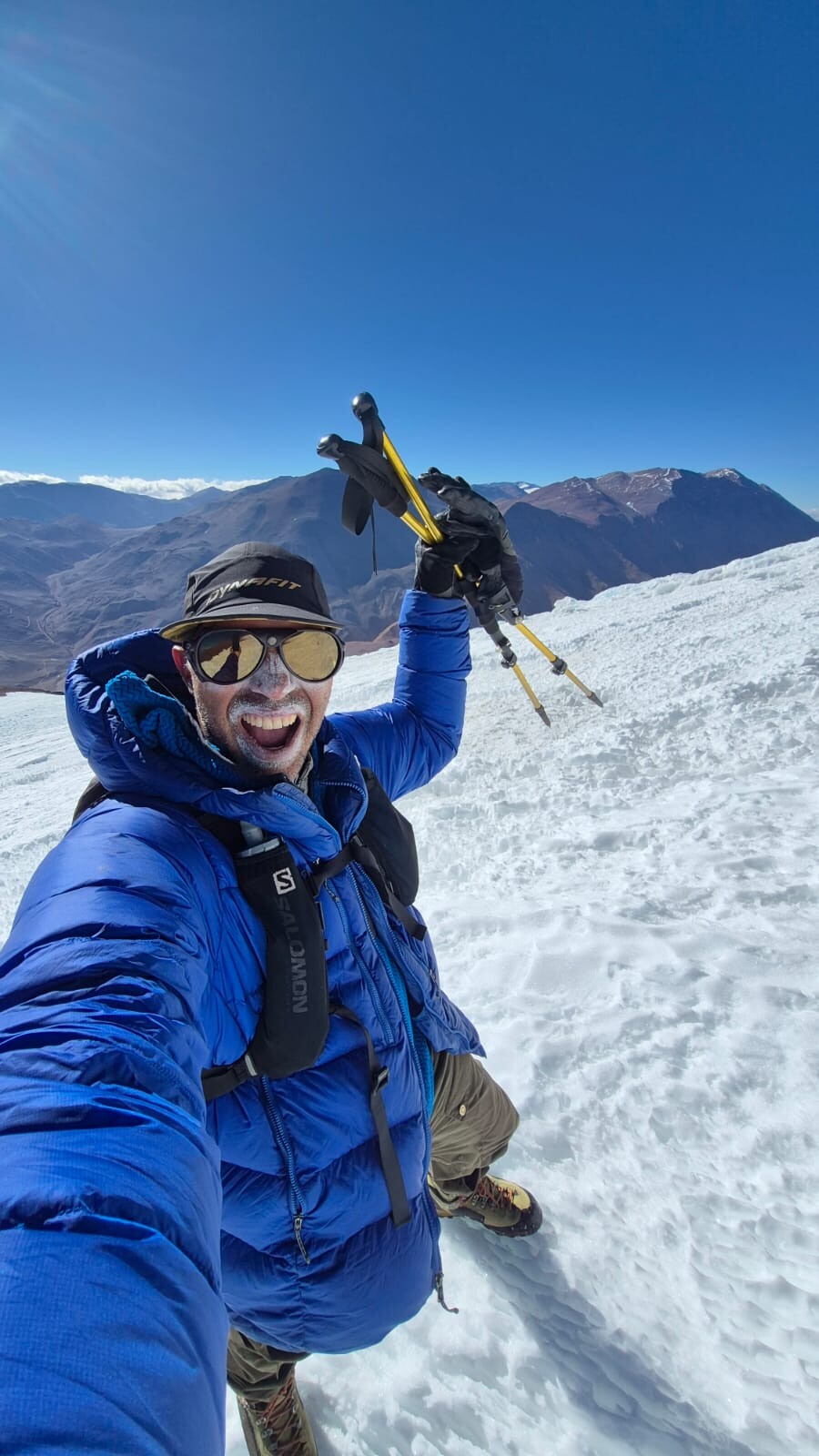 Al dia siguiente 4am caminando hacia la cumbre. Por acarreos virgenes y algunas pasadas de piedrecilla o ya de frenton rocas. No segui la ruta normal, queria algo unico para mi asi que encare de frente donde tuve algunaa pasadas de III /IV grado y aristas muy aereas que me iban dando una linea natural entre estos obstaculos. Ultimo tramo sobre los 5.200m de un acarreo infame muy parado solo quedaba darle de frente hasta llegar a un planito y encontrar el casco glaciar de escasos 40cms de espesor. Ahi arriba el hielo era puro, gris y con pequeñas formaciones de penitentes enanos. Camine a lo alto y ya no habia mas. 9am. 5 horas en total, 1.386 metros de desnivel y al pareder, por una nueva ruta. Me sentí feliz, tome un par de fotos hasta que se me congeló el celu y bajè. En menos de 2 horas estaba en camp feliz de haberlo logrado junto a mi tremendo equipo!