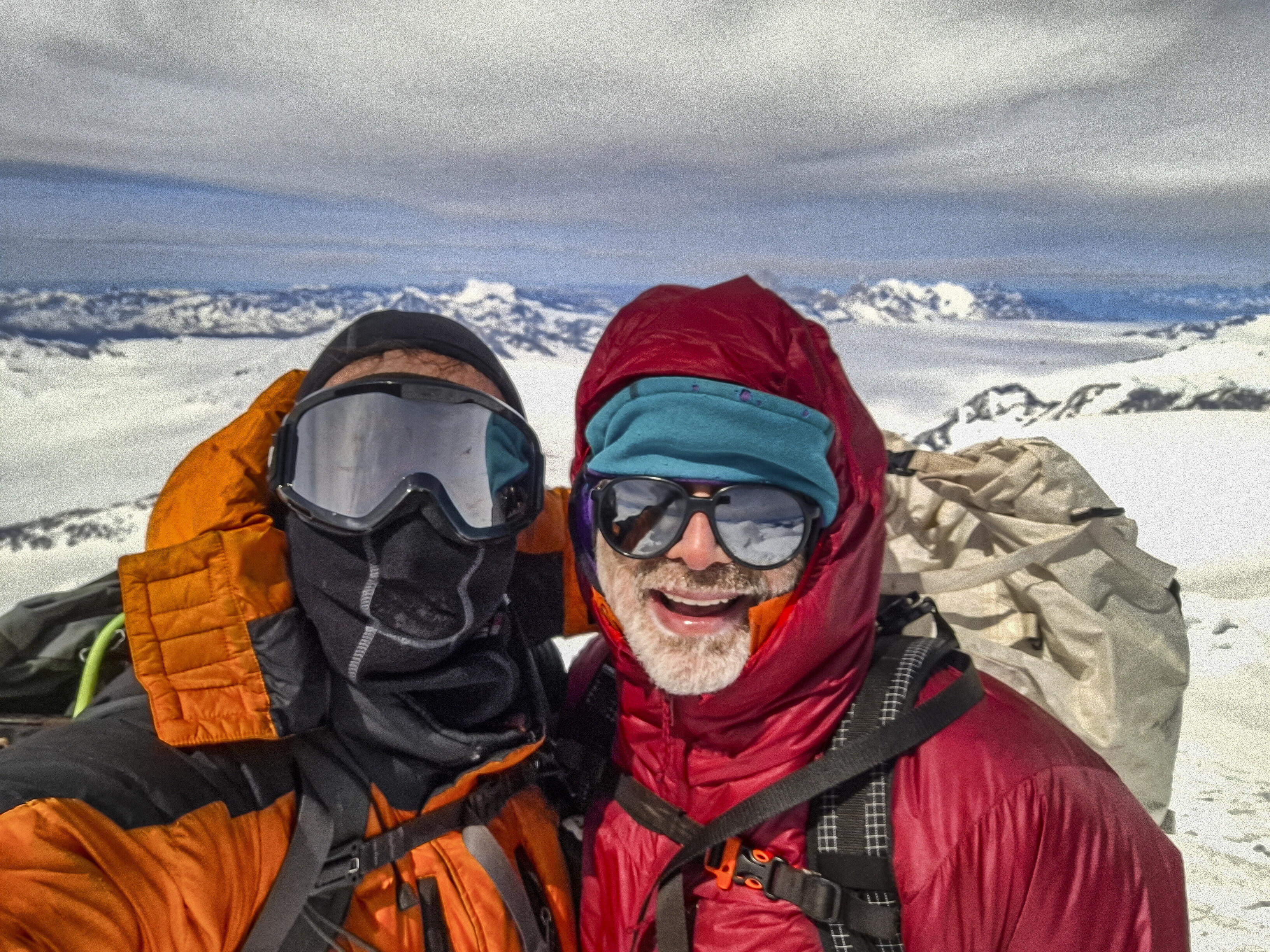 5 noviembre. salida 3 am. 11 horas de ascenso hasta los 3609 mts. por GPS. subida por la cara este, grietas abajo pasamos la angostura sorteando mas grietas luego la rampa de 700 mts, alcanzando la ancha arista cumbrera que nos recibe con nubes y cero visibilidad. navegamos a GPS el domo de 600 mts antes de caer a la caldera del volcàn donde se despeja, cruzamos la caldera y se sube por la arista o reborde norte a la minuscula cumbre. sin viento. todo el hielo patagonico a nuestros pies depejado. visiòn 360 de locura. Posiblemente 2ª ascenso chileno.