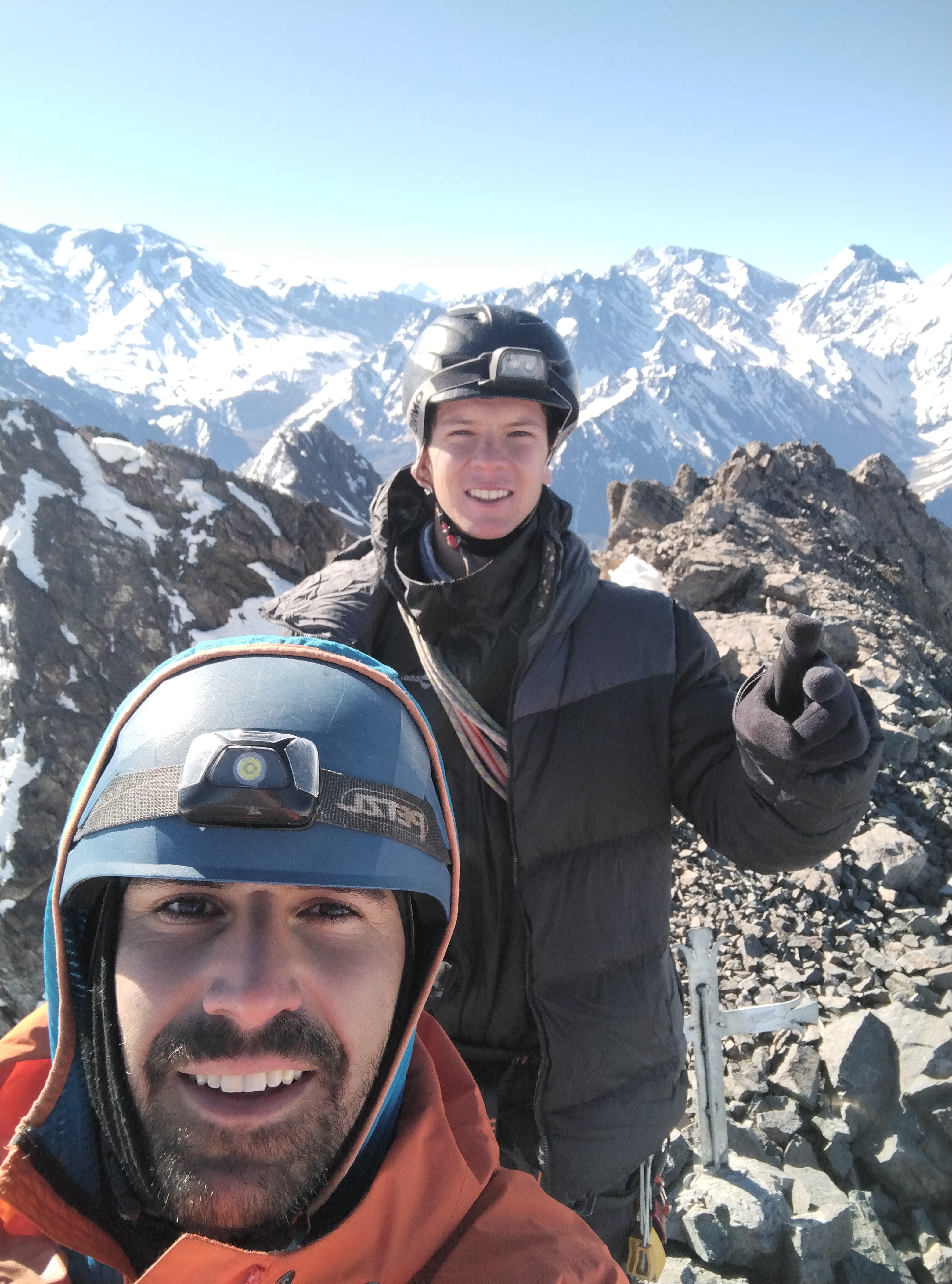 Excelentes condiciones, nieve compacta luego de unos dias fríos y porque salimos bien bien temprano. La última parte del canalón con harta nieve polvo y salimos hacia la izquierda abajo de la cornisa. De la cumbre al portezuelo en que uno asegura tiene para rapelar, dejamos otro cordín en una piedra desde donde se asegura para rapelar hacia el final del canalón.