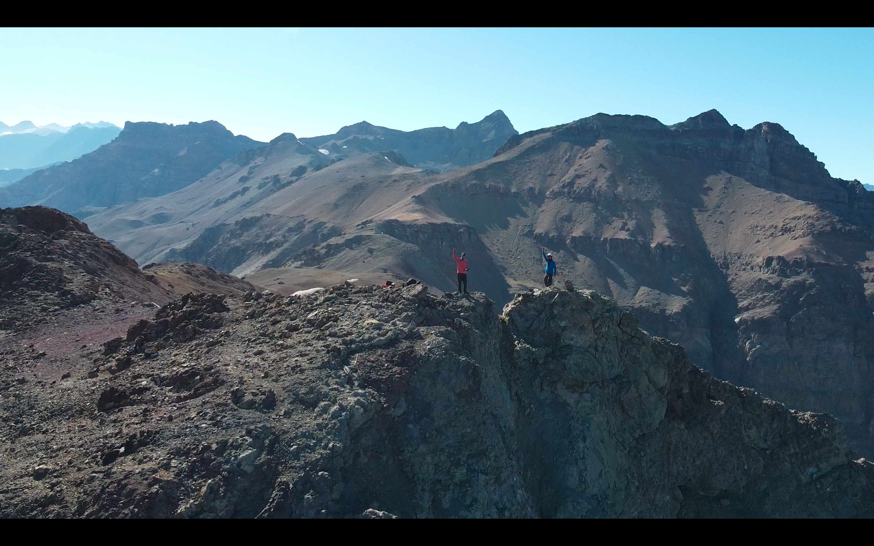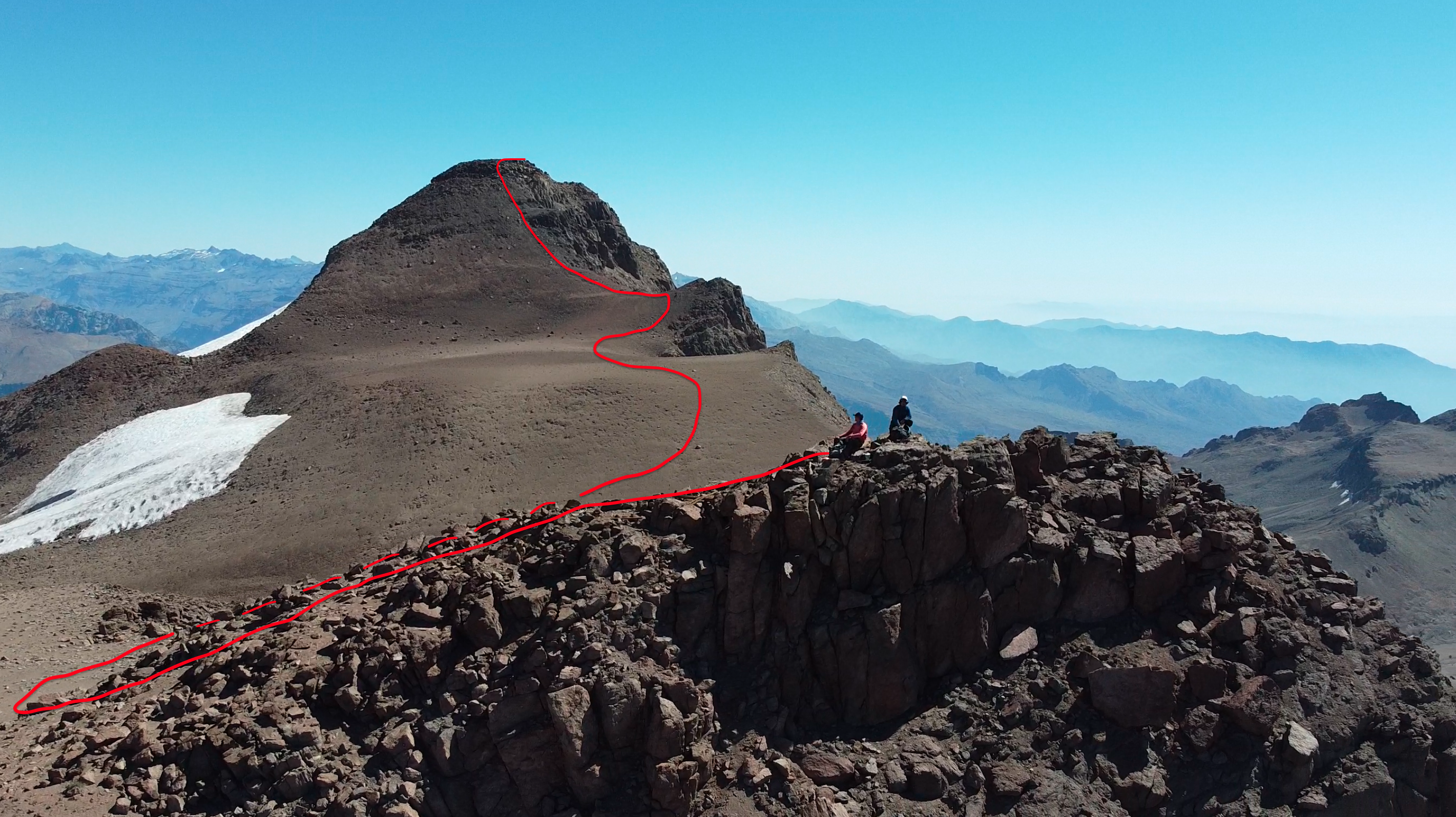 Desde la cumbre del cerro Manantiales (3510m) se desciende hacia el sur, para luego ascender hacia el suroeste siguiendo el filo del cordón que conecta directamente con el cerro Mirador del Manantiales. El recorrido comienza con un descenso de unos 100m que requieren cuidado debido a que presentan exposición (de ser necesario podría requerir algún rapel) y transitan por acarreos y roca suelta (Ver foto 23). Tras 1h aproximadamente, la ruta vuelve a ganar altura por el filo principal en dirección Suroeste, sin presentar mayores dificultades técnicas, aunque sí requiere atención por la exposición en algunos tramos angostos (Ver foto 24). El terreno combina secciones de roca firme y acarreo inestable. El tramo final de ascenso al cerro Mirador de Manantiales (Ver foto 25) se realiza por su arista Sureste ( 2h aprox.), la cual presenta pendientes más empinadas y terreno mixto de roca y acarreo. En condiciones invernales, esta sección puede estar cubierta de nieve dura o hielo, lo que hace necesario el uso de crampones y piolet.