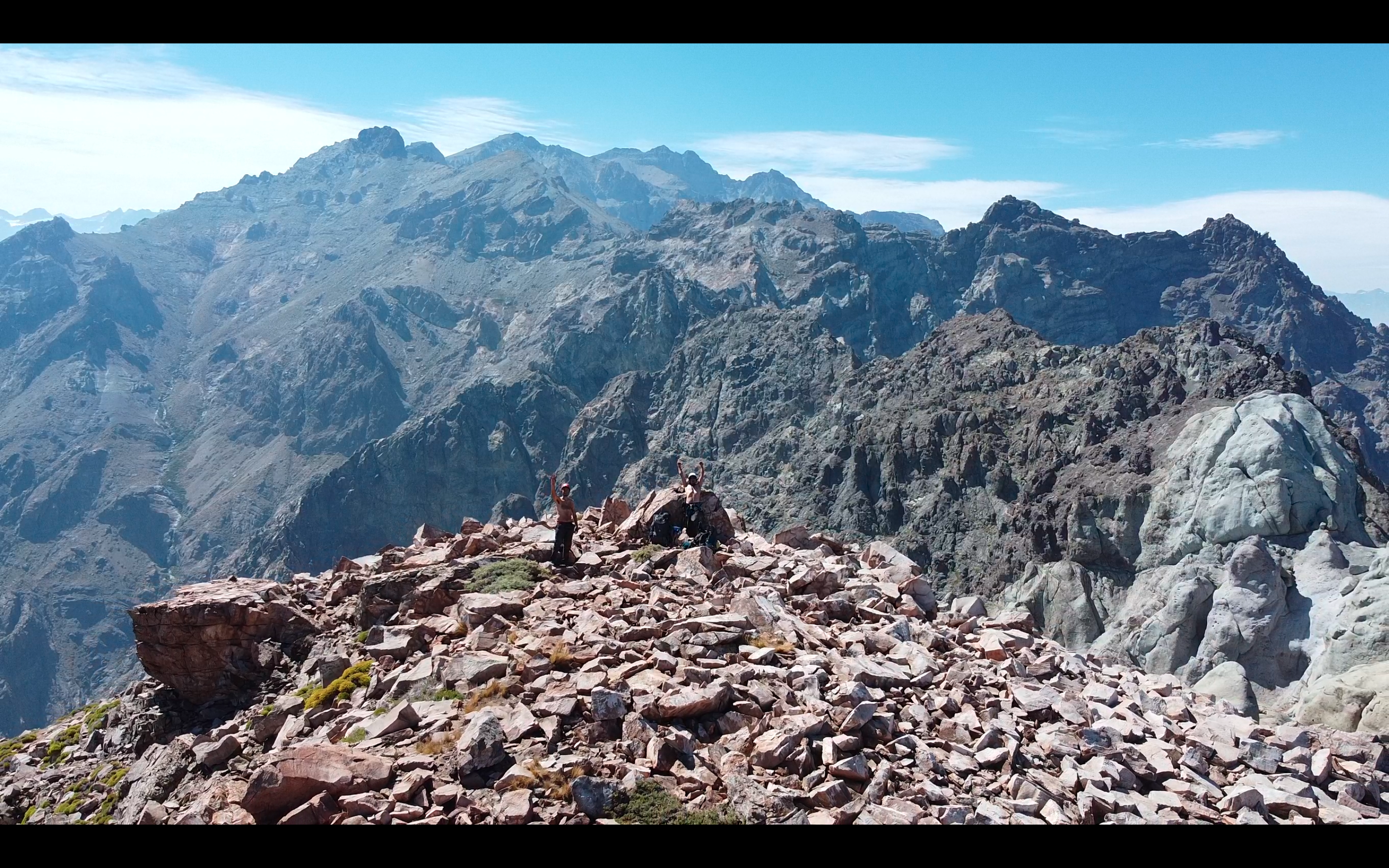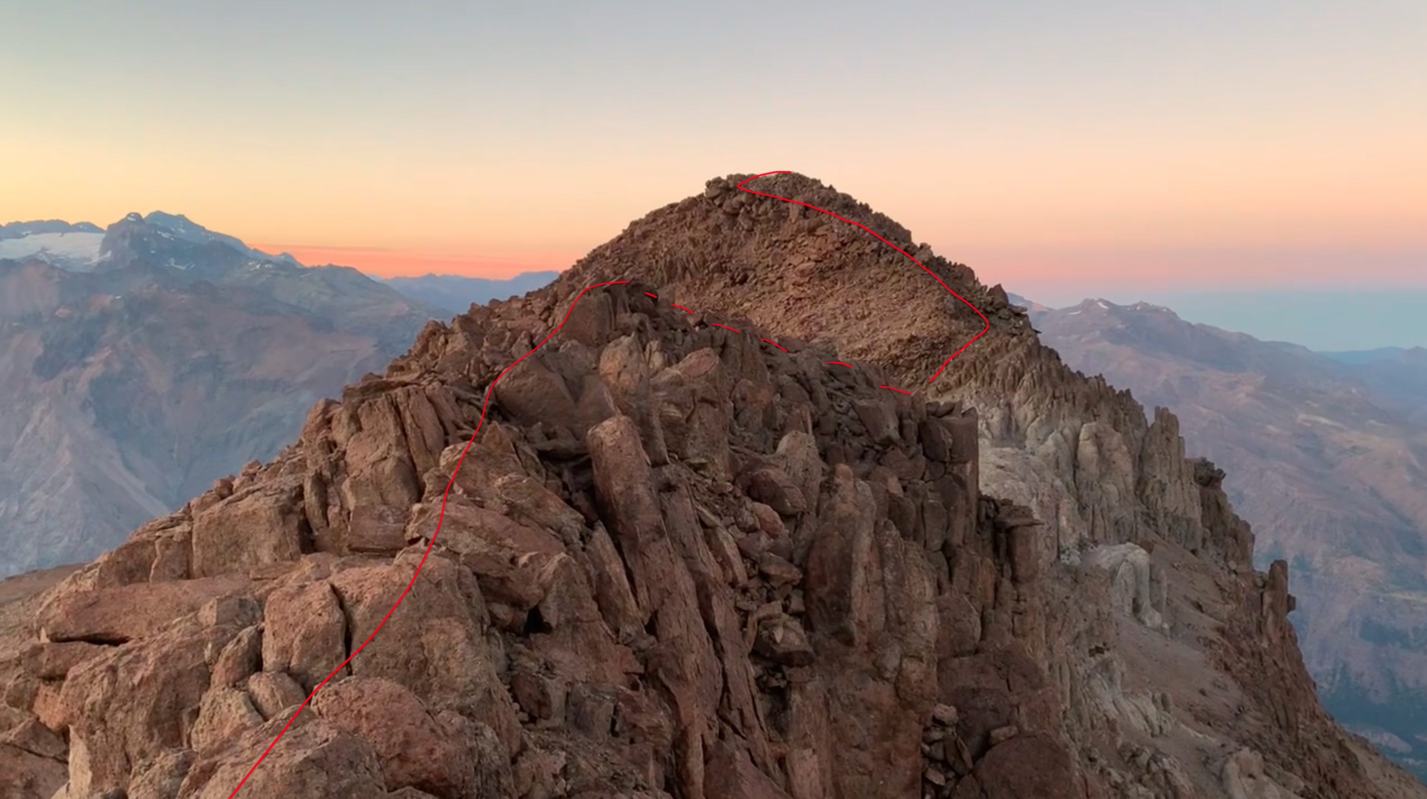 Tras unas 2h a 3h de marcha, se alcanza un sector de rocas grandes donde el filo se hace más marcado. Aquí se debe progresar por una huella casi inexistente hasta la cumbre, siempre manteniendo la dirección oriente hacia la arista principal, pero no presenta mayores dificultades técnicas más allá del cuidado en la progresión.