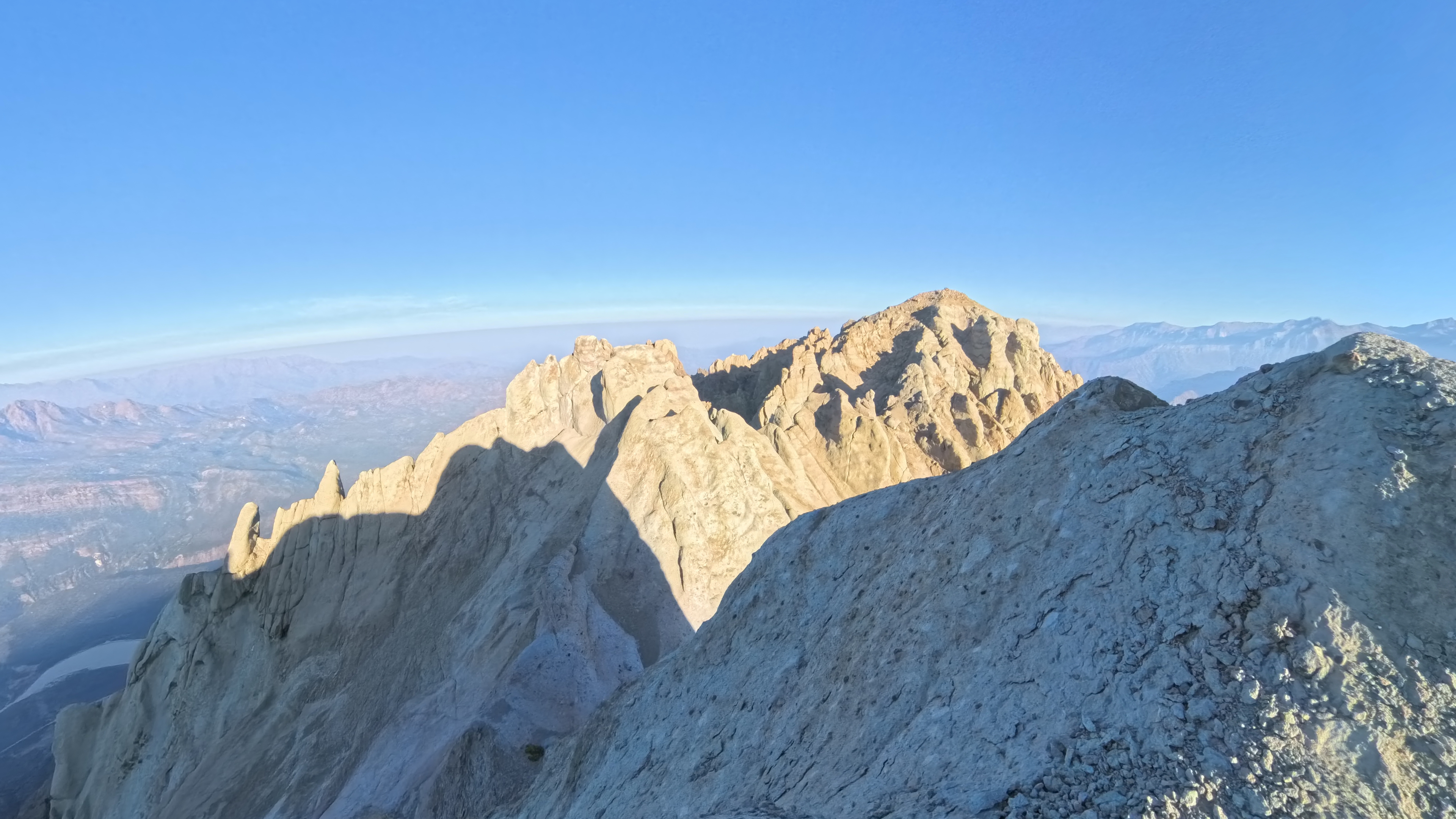 Una vez en la cumbre del cerro Agujereado (Ver foto 48), la vista desde la cumbre ofrece una perspectiva privilegiada del Laberinto Piroclástico recién superado, permitiendo observar desde altura sus corredores, pilares y las terrazas por las que se avanzó desde el Alto del Guayacán. Mientras que hacia el este se elevan las cumbres ya conquistadas del cordón — Manantiales, Alto del Retamal y Tinajón (Ver foto 49) —, mientras que hacia el norte emergen nuevamente las siluetas del Socavones de Pangal y la cordillera principal. Al sur se distingue el Alto del Collay y, en días despejados, incluso parte de la Cordillera de la Costa.