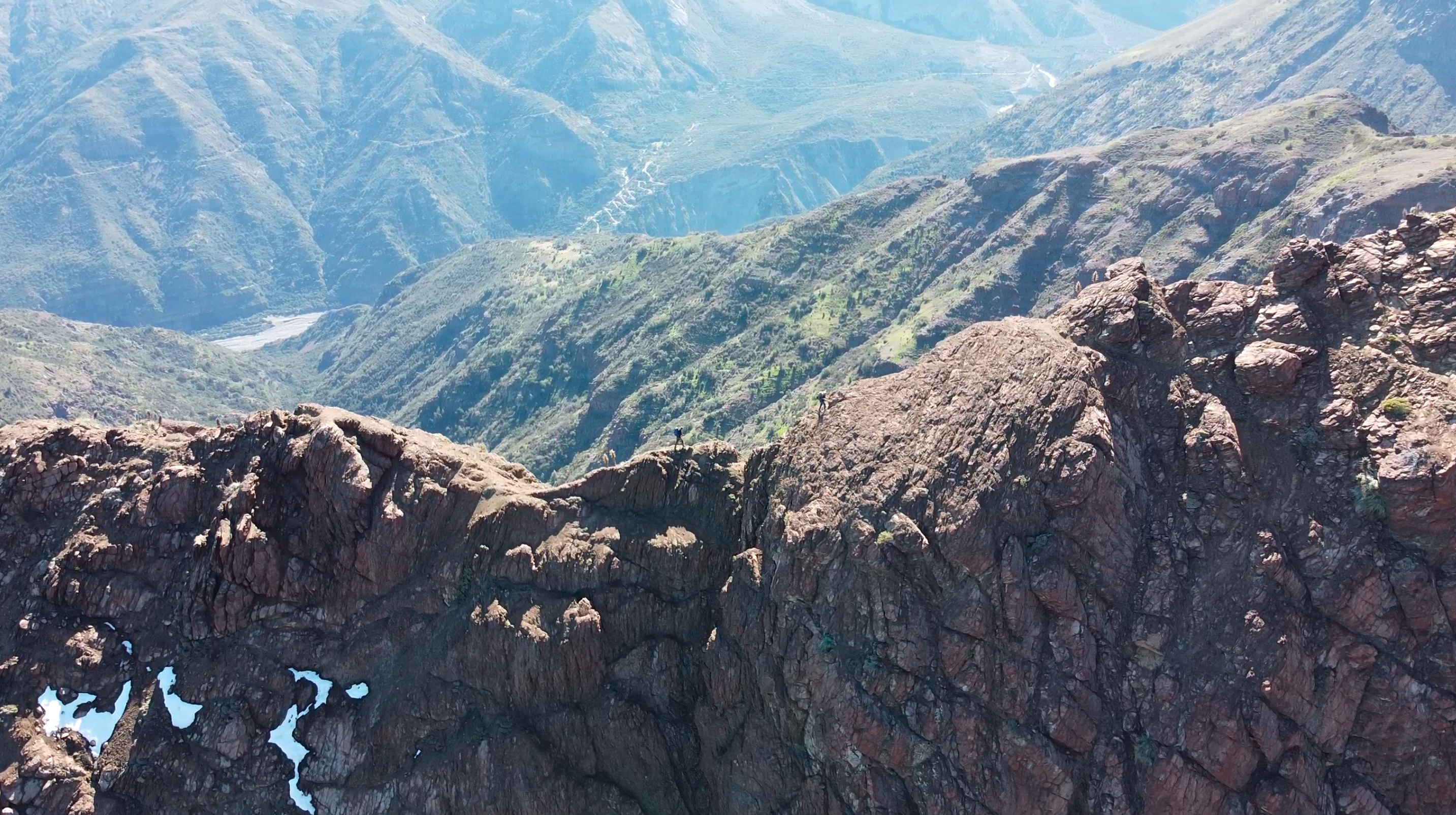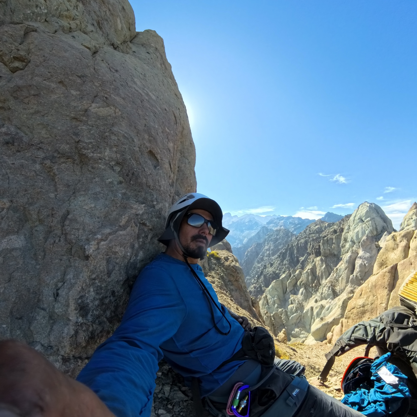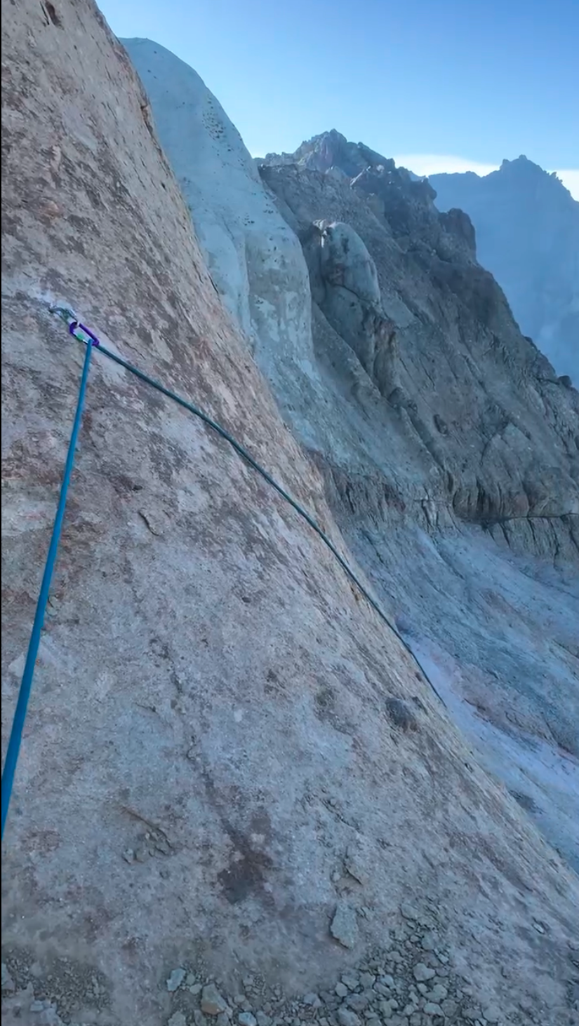 Desde el Campamento 3, instalado en una pequeña planicie protegida por murallones volcánicos, el avance hacia la última cumbre del cordón comienza en dirección Noroeste. La salida del campamento es inmediata y exigente: debido a la extrema fragilidad del material piroclástico, se debe realizar una serie de rápeles cortos para descender los primeros resaltes y acceder al sistema de canaletas que marca el inicio del tramo más complejo de toda la travesía. Esta sección constituye la parte más difícil del recorrido, donde la progresión exige un constante trabajo técnico para escalar, rapelear y descifrar los corredores del laberinto, avanzando entre terrazas erosionadas, cornisas inestables y cortes verticales que obligan a buscar la línea más segura (Ver foto 44).