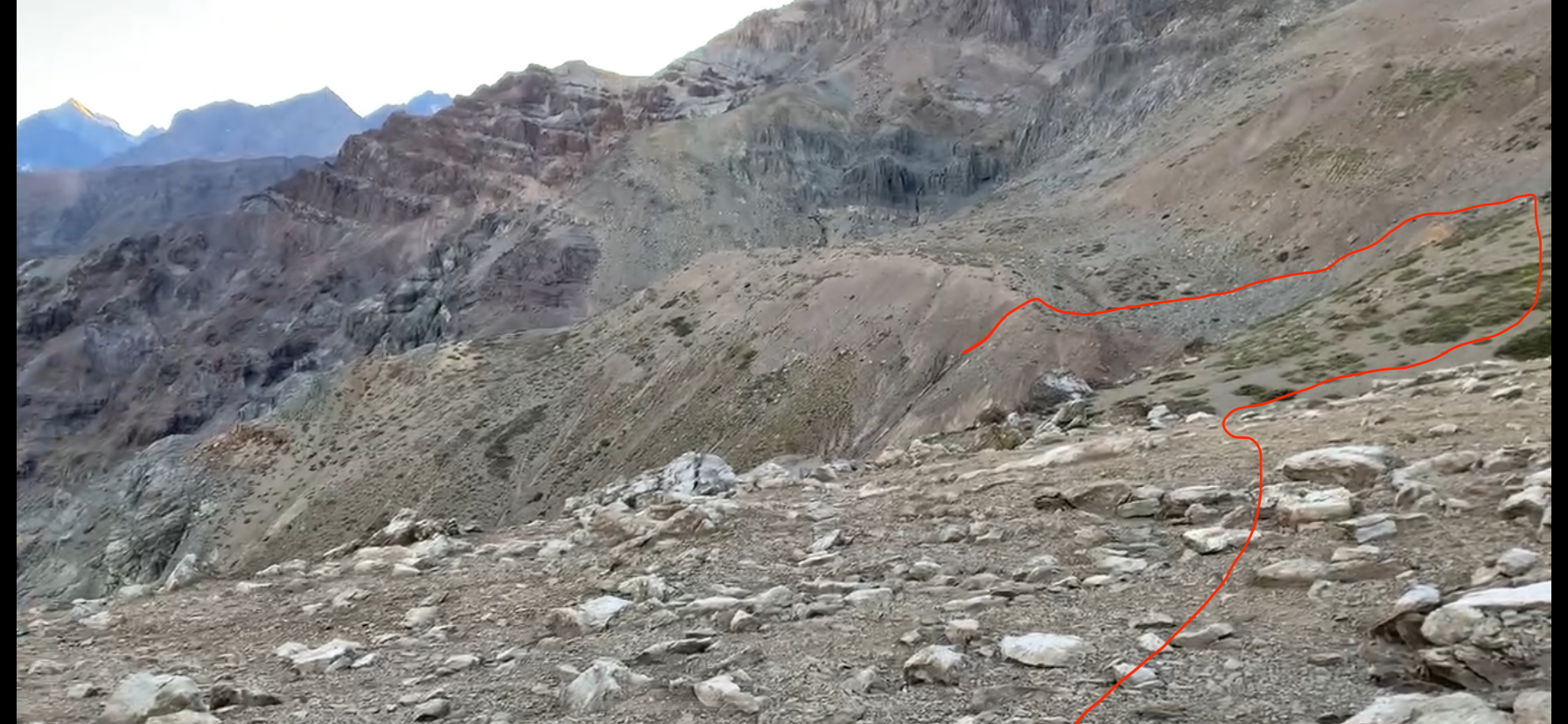 El primer tramo avanza por pendientes moderadas sobre terreno mixto de roca firme y acarreo compacto, permitiendo un progreso fluido. A medida que se asciende, el filo se angosta y aparecen pequeñas terrazas intercaladas con secciones más empinadas, donde se recomienda mantener una ruta más óptima para evitar zonas de material suelto.