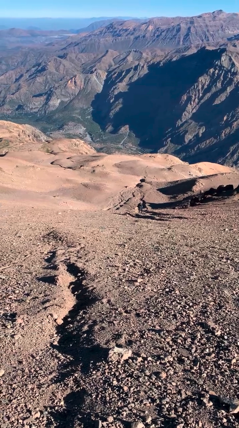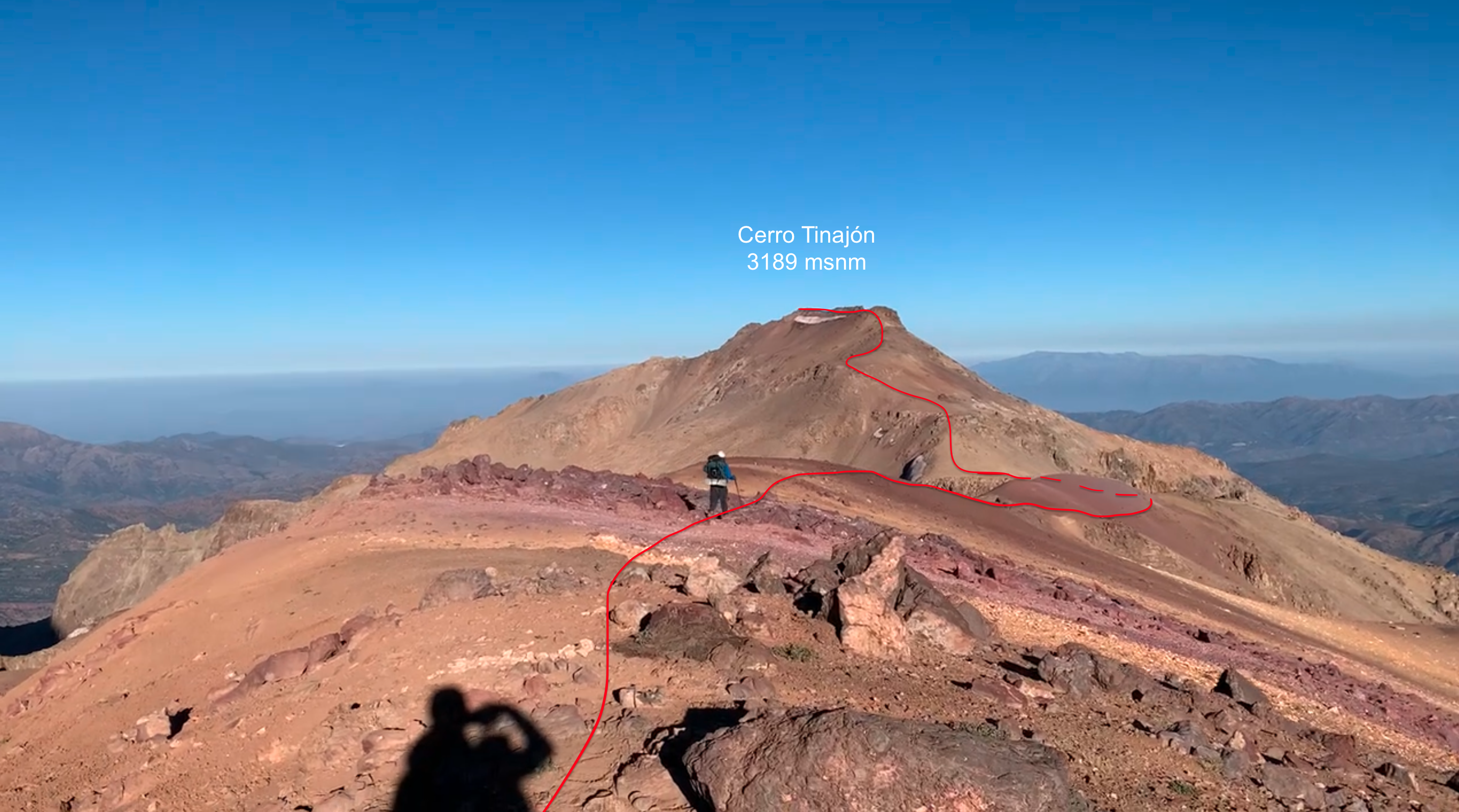 Desde la cumbre del cerro Alto del Retamal (3370m) se debe retornar en dirección norte hasta el campamento base 2, para luego seguir en dirección Oeste por el filo principal del cordón, siguiendo una huella poco marcada, pero evidente que conecta este punto con el cerro Tinajón. El trayecto presenta una serie de lomas y contrafuertes menores, con sectores de roca firme intercalados con tramos de acarreo suelto, aunque en general el avance resulta cómodo y continuo (Ver foto 34). Tras aproximadamente 2,5km de progresión, se alcanza una pequeña depresión (cota cercana a los 3070m), desde donde comienza el ascenso hacia el cerro Tinajón. Este tramo presenta pendientes poco pronunciadas y una franja de roca descompuesta en la parte superior, donde se recomienda precaución.