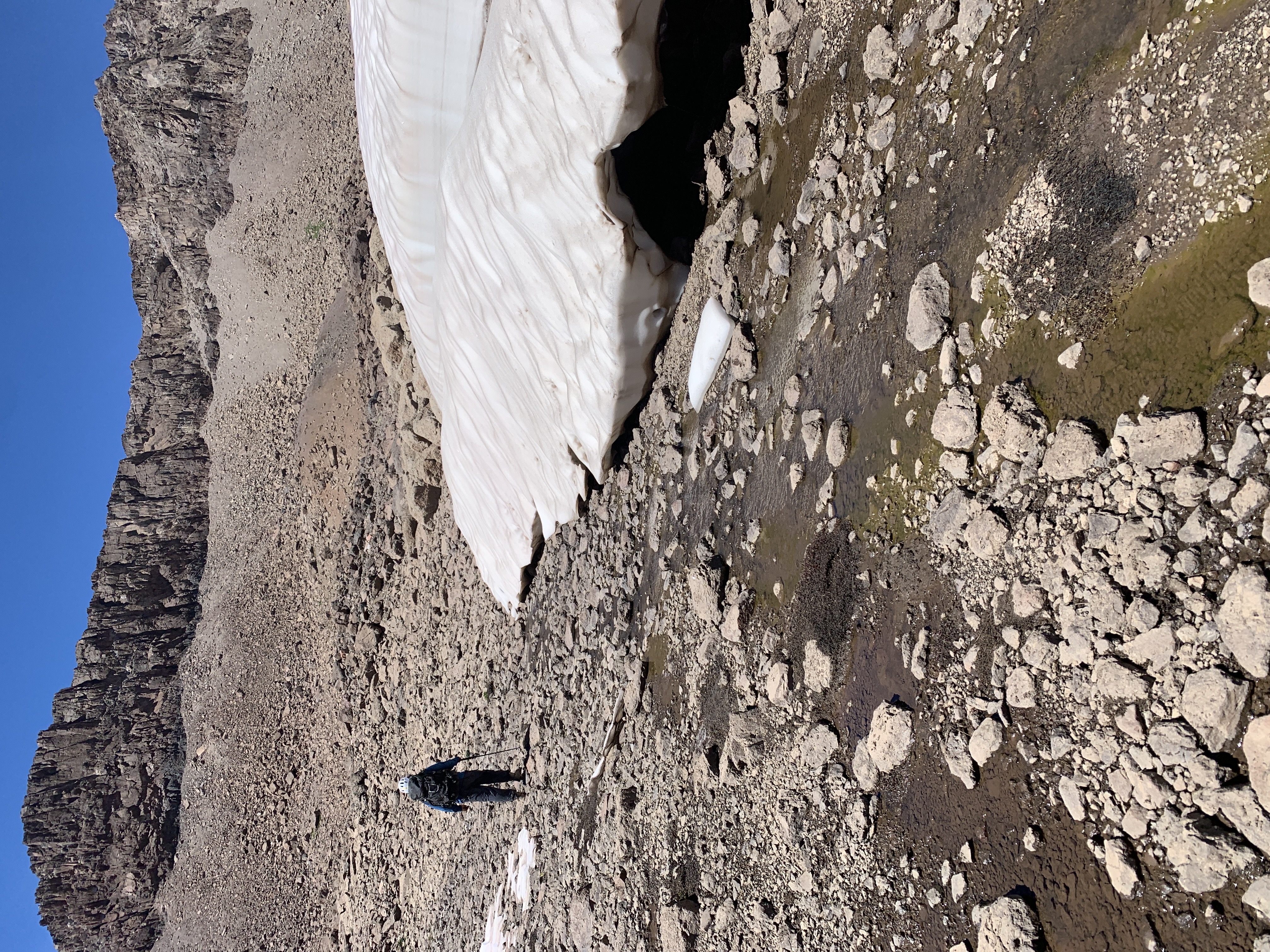 Desde la cumbre del cerro Sesquicentenario (3404m) se continúa hacia el Este, descendiendo por el mismo filo que conecta directamente con el cerro Manantiales. El primer tramo corresponde a una bajada moderada de unos 100m (Ver foto 13) a través de acarreo y bloques rocosos (Ver foto 14) hasta alcanzar una planicie a unos 3250m que mantiene vertientes que son ideales para abastecerse de agua (Ver foto 15).