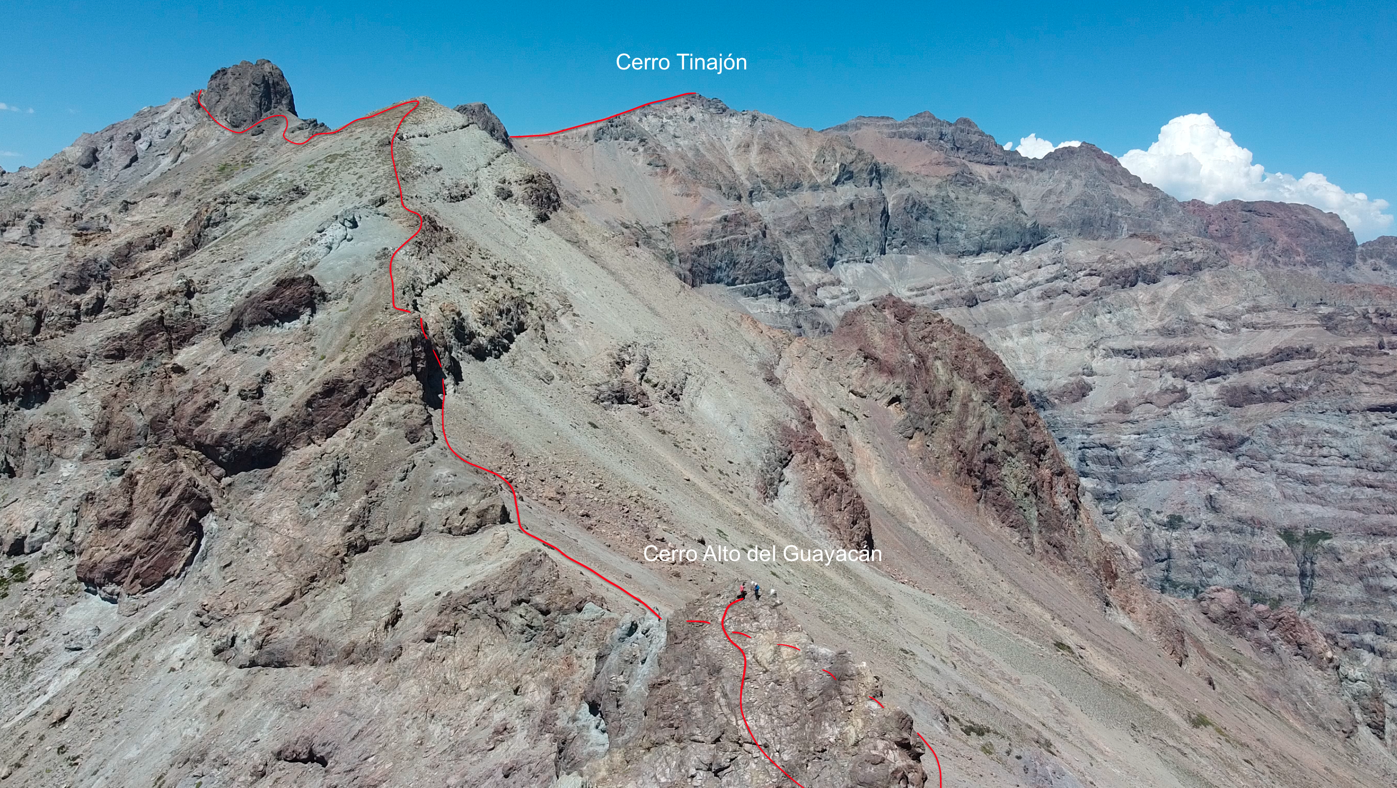 Desde la cumbre del cerro Tinajón, se continúa por el filo principal del cordón en dirección Noroeste por unos 2,5km, siguiendo una línea bien definida que desciende suavemente entre lomajes amplios y sectores de roca fragmentada, hasta llegar a una visible punta oscura perteneciente al filo del cordón (aunque no es reconocida como un cerro puntualmente), la que se debe bordear por su lado norte, donde la bajada se hace más pronunciada, debiendo superar unos trepes. En este punto la ruta gira en dirección Suroeste por aprox 2 km, donde el terreno combina acarreo estable con tramos de roca firme, permitiendo un avance fluido y con buena orientación visual hacia el próximo objetivo, el Cerro Alto del Guayacán, visible desde casi todo el recorrido (Ver foto 36).