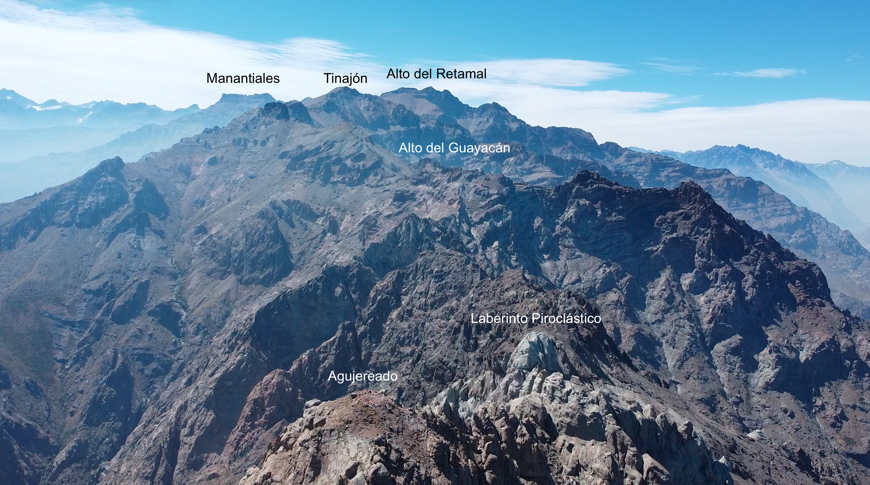 La cumbre del cerro Alto del Guayacán (Ver foto 38) ofrece una vista privilegiada hacia el sector occidental del cordón, destacando el cerro Agujereado y su conexión con él, el denominado "Laberinto Piroclástico", que es la parte más técnica, expuesta y compleja de toda la travesía.
