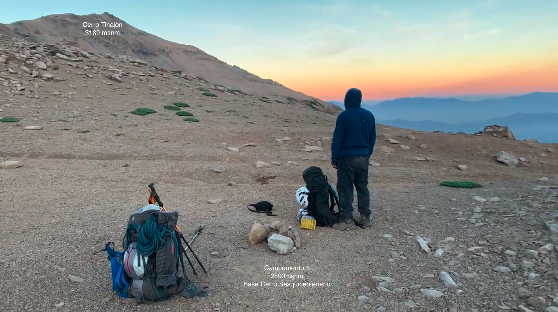 Para esta primera jornada considerar un tiempo estimado de unas 6h a 7h desde la bocatoma hasta el campamento base, según condiciones. Siendo unos 1400m de desnivel sin dificultad técnica.