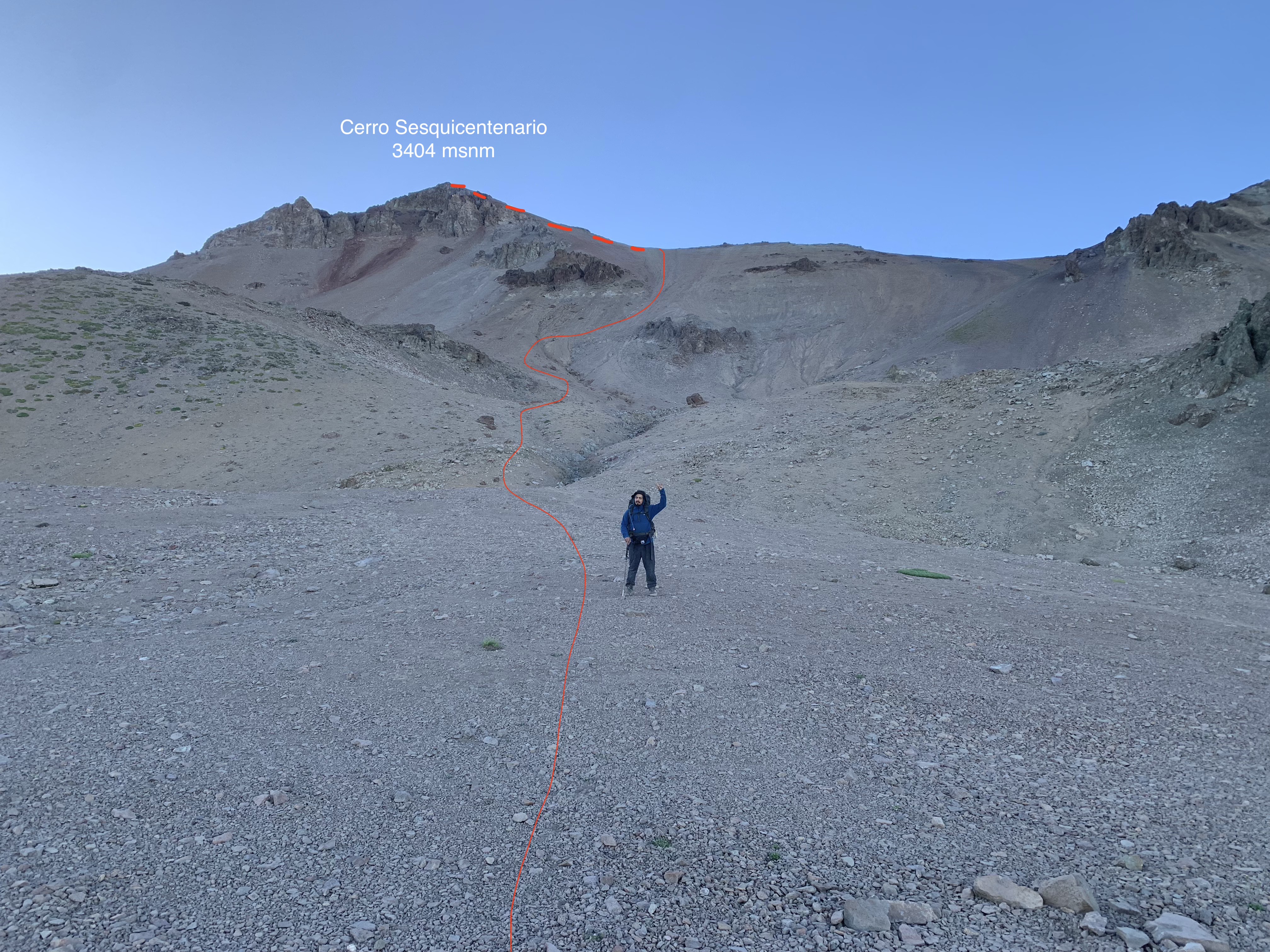 Desde el campo base (2800m), ubicado en la planicie al pie del cerro Sesquicentenario, se inicia la marcha ascendiendo por la ladera amplia (Ver foto 8) y de pendiente moderada (Ver foto 9) que conduce hacia el filo Oeste del Sesquicentenario, desde aquí es posible ver el cerro Duende (Ver foto 10), el más alto del Cordón de Manantiales. El terreno corresponde principalmente a acarreo firme y tramos donde el sendero deja de existir.
