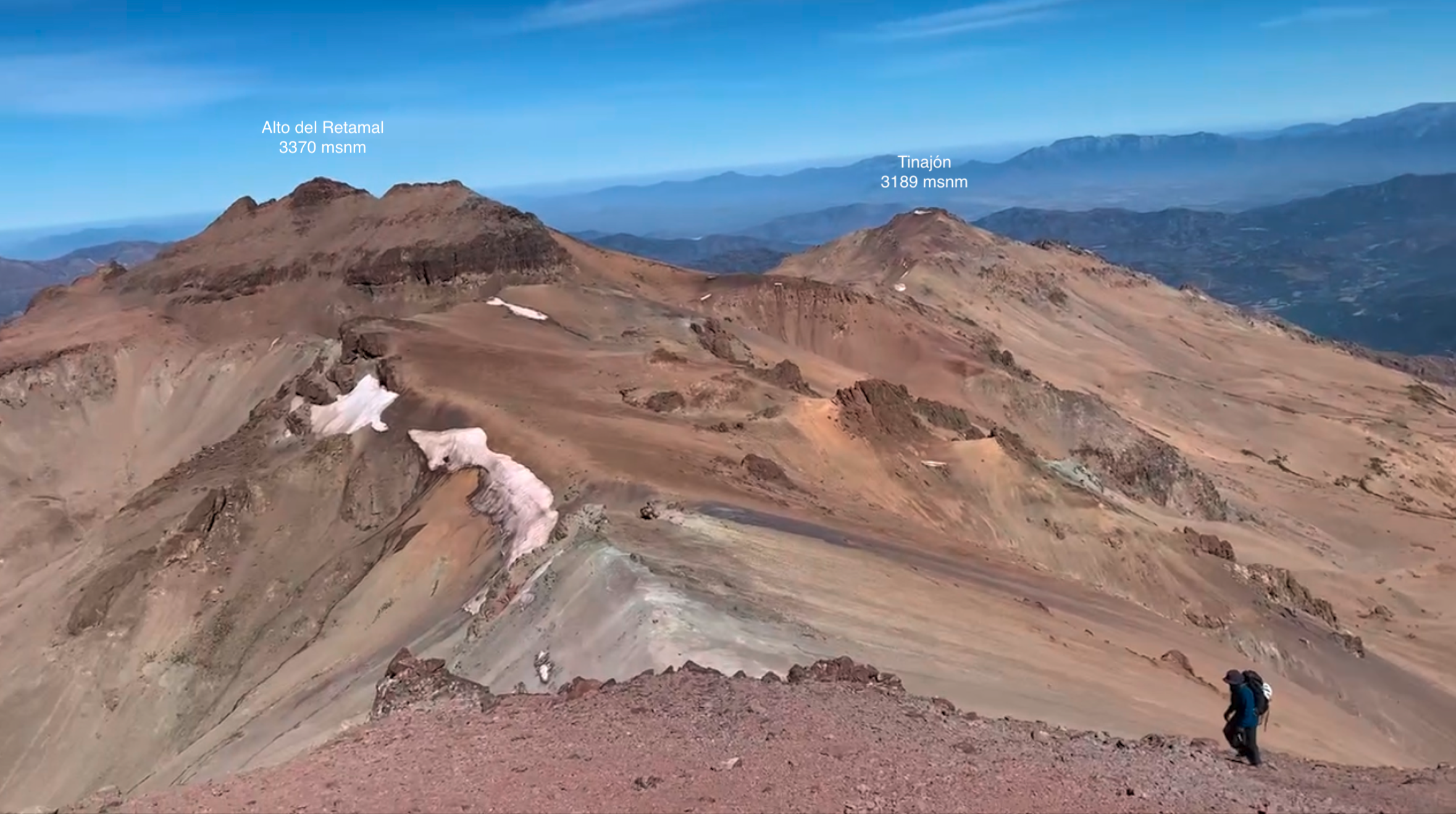 A unos 3350m se ingresa al tramo final (Ver foto 32), caracterizado por una breve franja de roca descompuesta que exige atención, especialmente en días de viento o con nieve residual. Superada esta sección, el filo se abre nuevamente y permite alcanzar la amplia y marcada cumbre del cerro Alto del Retamal (3370m) (Ver foto 33), uno de los puntos más altos del Cordón de los Manantiales y un excelente mirador hacia toda la ruta que se ha realizado y de la que aún queda por enfrentar para lograr la conexión de todas las cumbres del cordón.