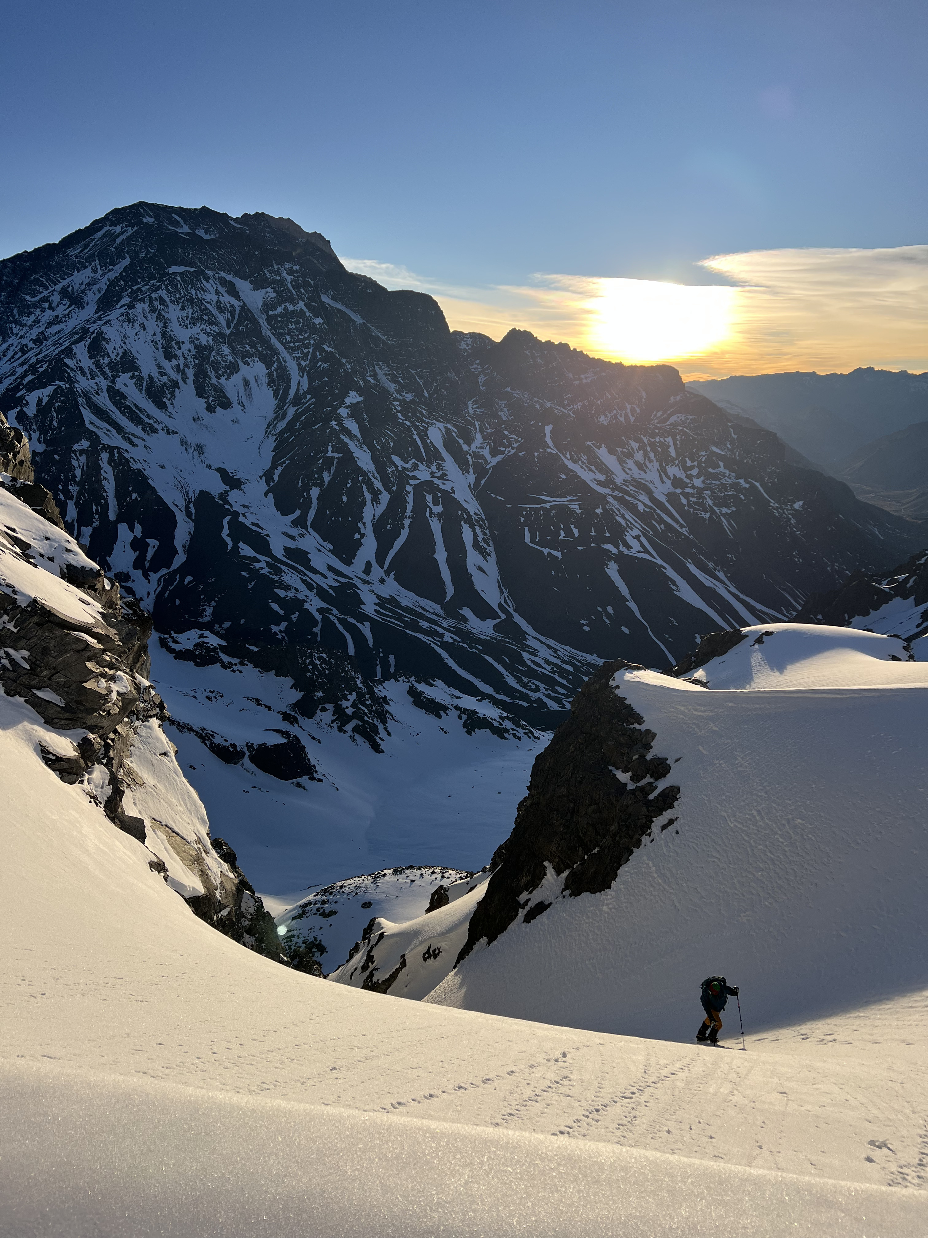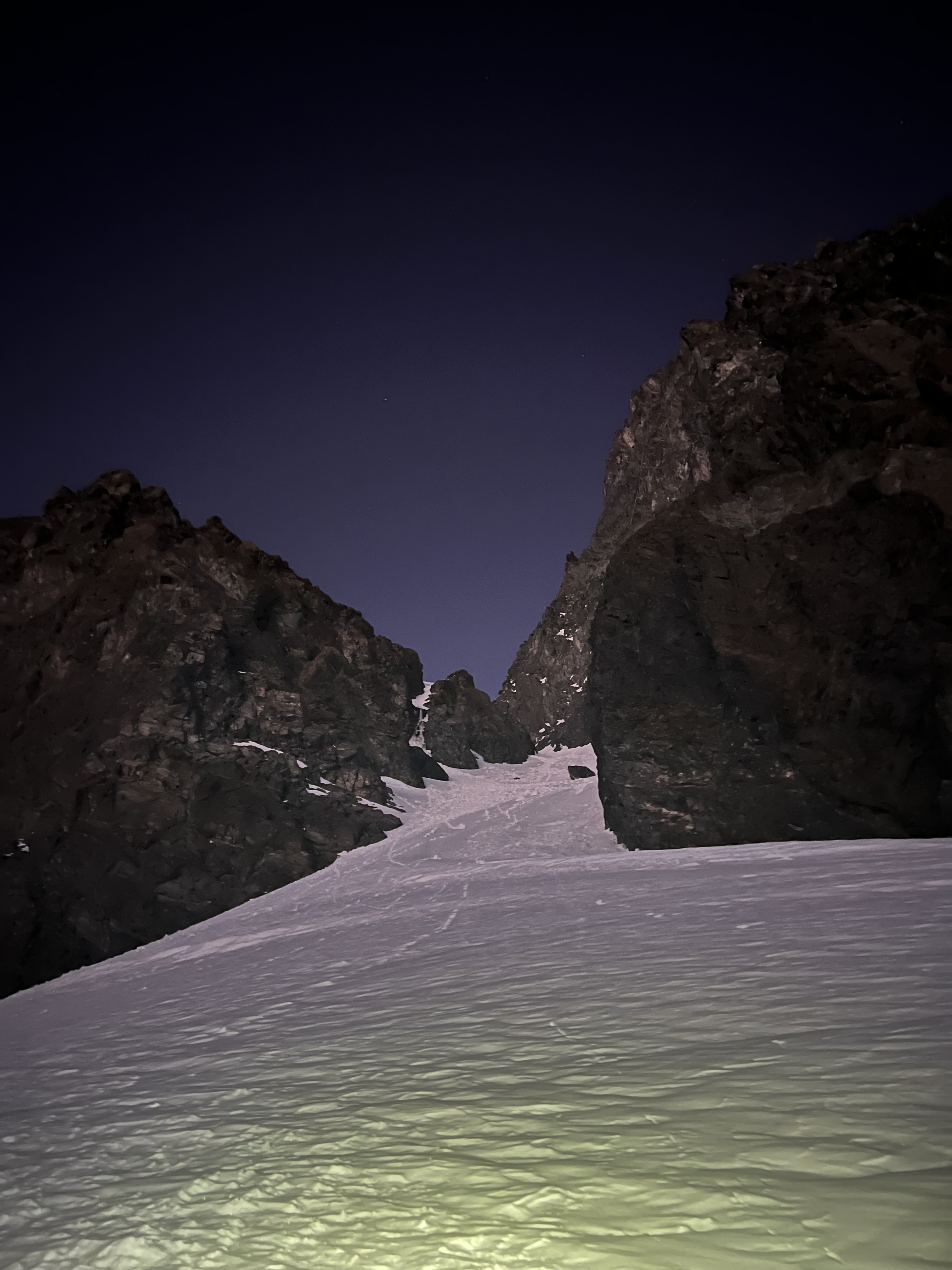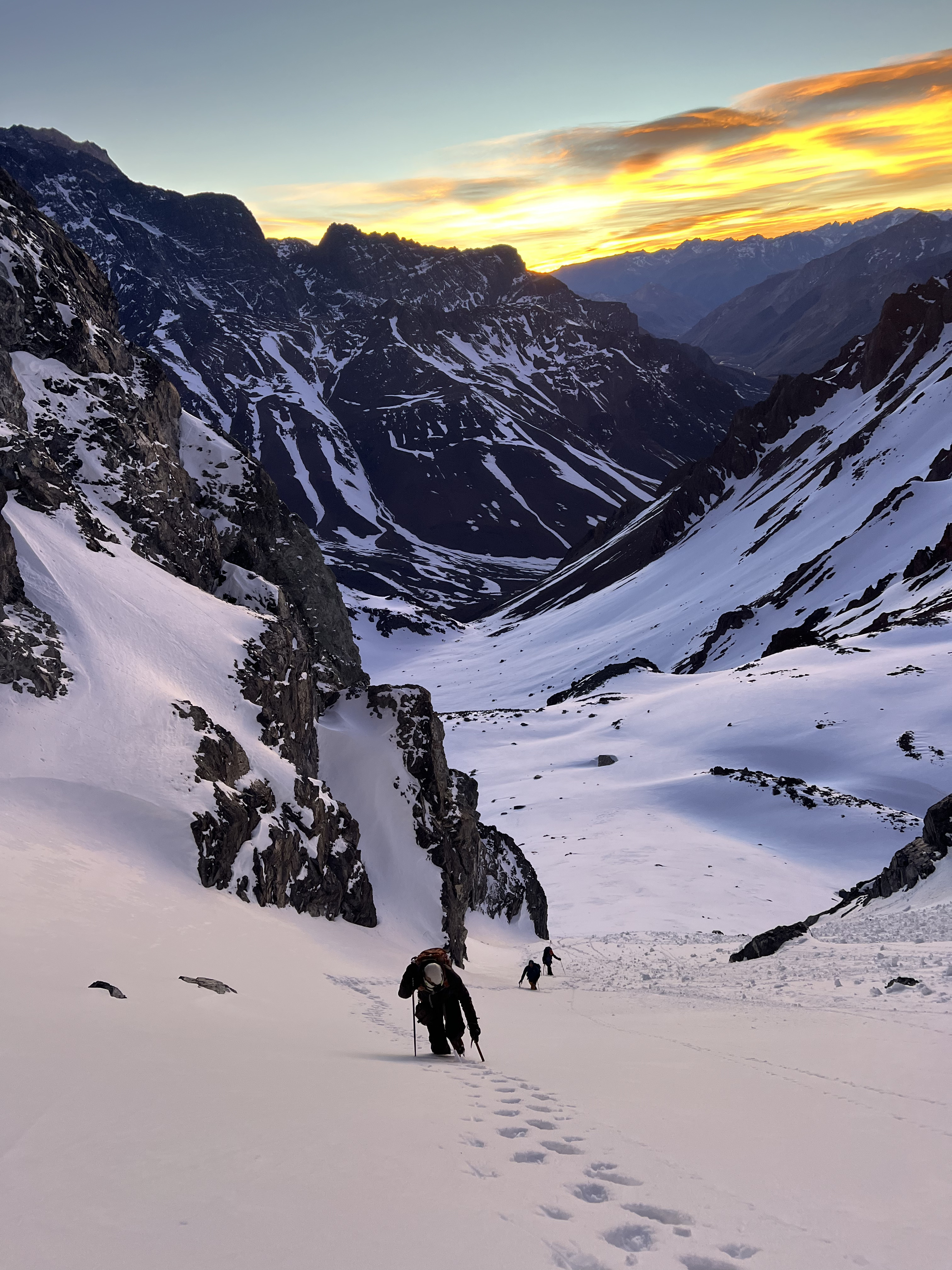 Desde el CB se debe enfilar directo hacia el oeste. La pendiente va aumentando y la ruta se va curvando ligeramente a la izquierda para llegar a los pies de la canaleta a 4039m Ver foto 8 Ver foto 9. Hasta aquí considerar 1½h de caminata. La pendiente es de 45° y no presenta mayor dificultad si las condiciones de la nieve son buenas Ver foto 10, y tras 50 minutos, se llega al portezuelo a 4240m, teniendo el Pico Gótico a la derecha (Norte)  Ver foto 11 y el cerro Caracoles a la izquierda (Sur). De fondo, hacia el Este, se aprecia el imponente cerro Tolosa Ver foto 12.
