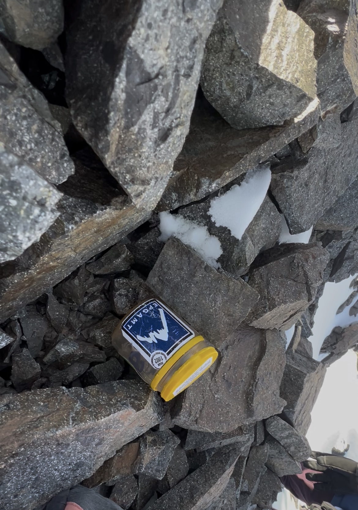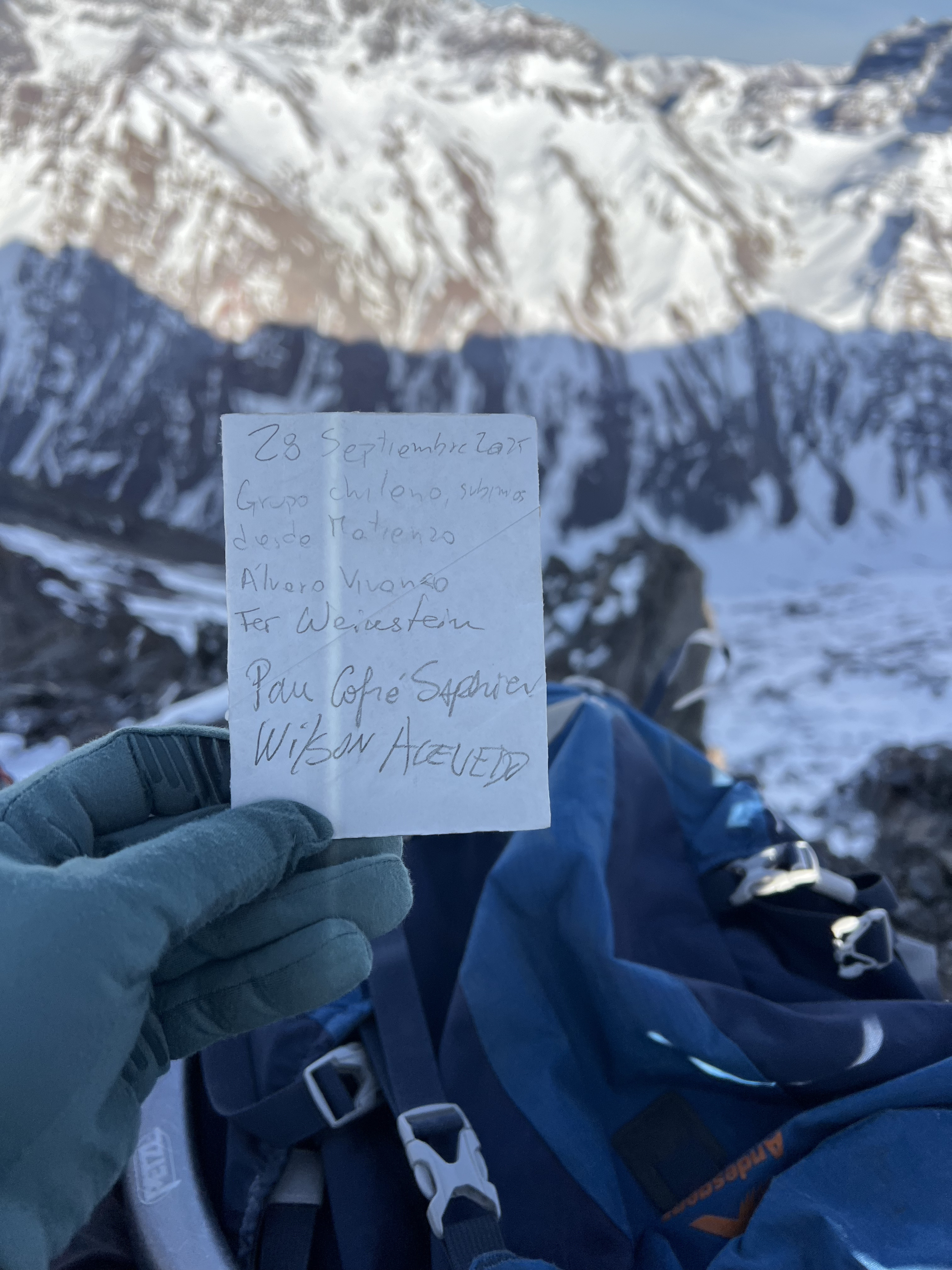La cumbre no es muy grande, pero caben unas cuatro personas. Allí se encuentra un frasco de vidrio de EPGAMT Ver foto 17 (Escuela Provincial de Guías de Alta Montaña), que fue dejado vacío y al que se le agregó un testimonio de un ascenso posterior Ver foto 18