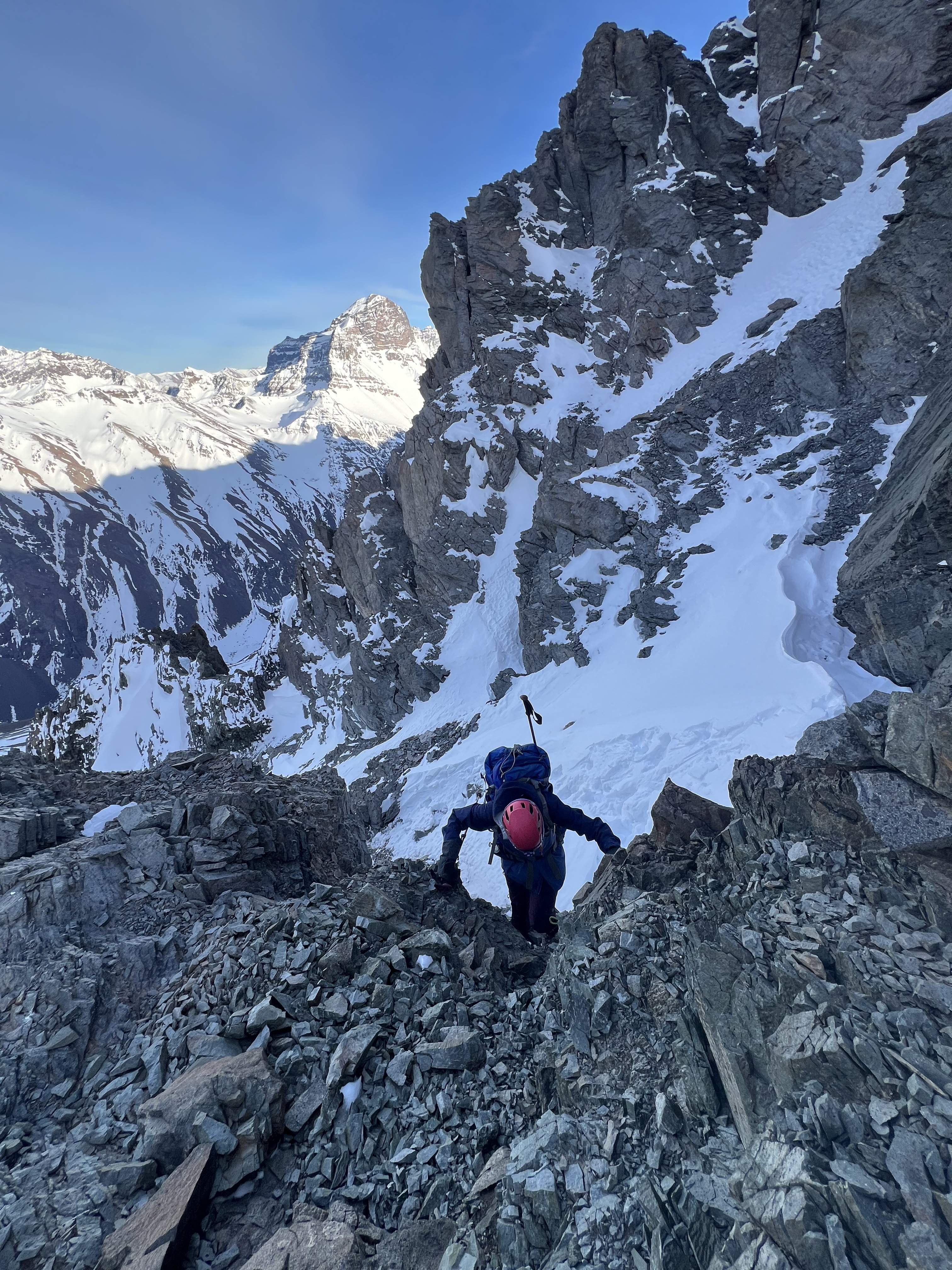 Desde el portezuelo ya se está muy cerca de la cumbre. Desde acá se debe ascender por la roca del Pico Gótico Ver foto 13, para lo cual es recomendable dar un pequeño rodeo hacia el norte, pasándose al lado chileno del cerro para luego comenzar a trepar por la roca siguiendo en paralelo una canaleta. El trepe no presenta gran dificultad y tiene poca exposición. La roca está un poco suelta por lo que hay que fijarse bien de donde afirmarse Ver foto 14 y Ver foto 15. Tras ½h desde el portezuelo se llega a la cumbre, siendo el último tramo de escalada el de mayor inclinación de la ruta Ver foto 16 por lo que se debe subir con precaución. Aquí la roca es de mala calidad y se suelta con facilidad, sin embargo, no se requiere asegurar.