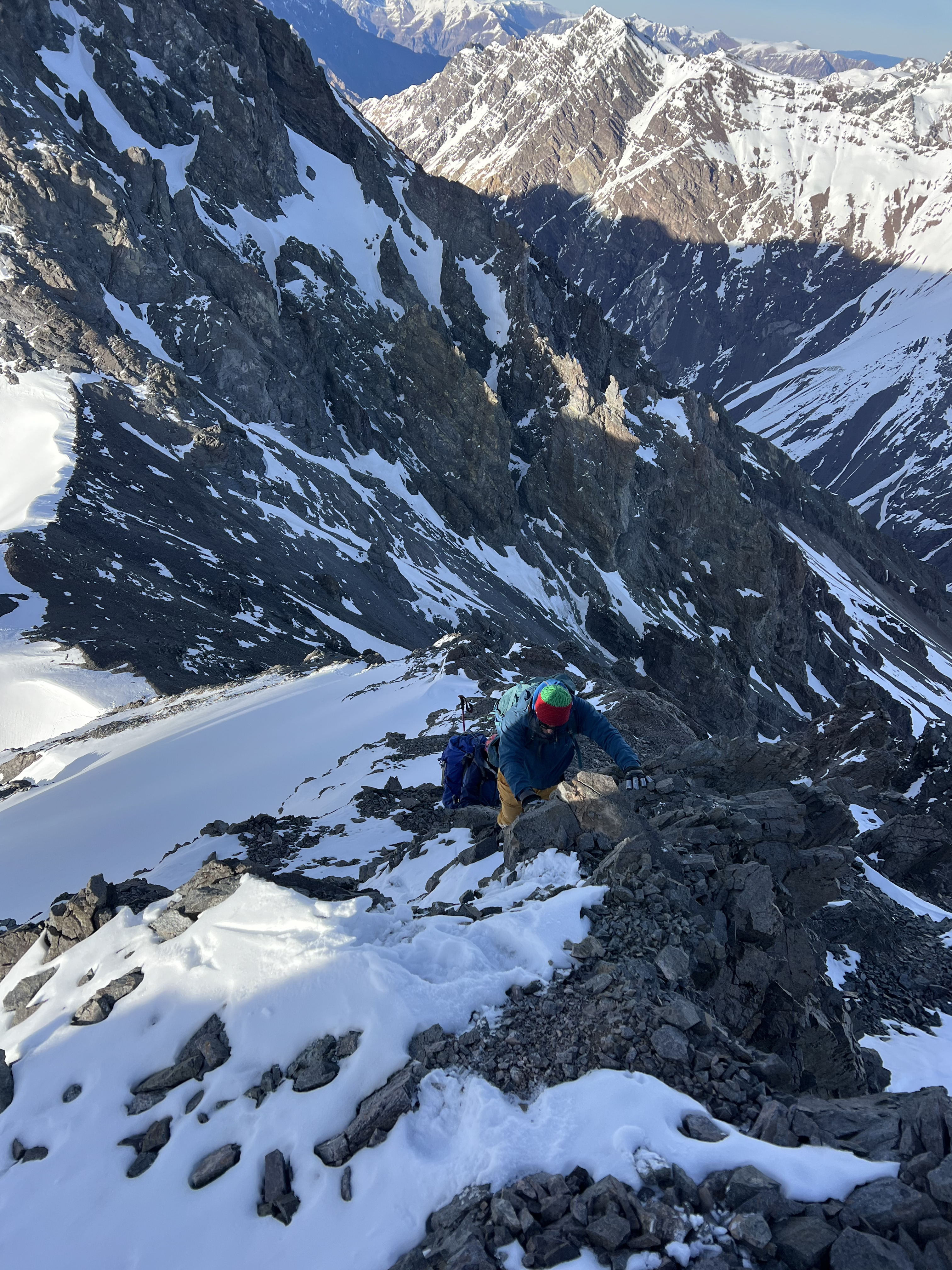 El descenso es por la misma ruta, hay que desescalar con cuidado, pero no es necesario hacer un rapel. De la cumbre al campo base considerar 1h 50'.