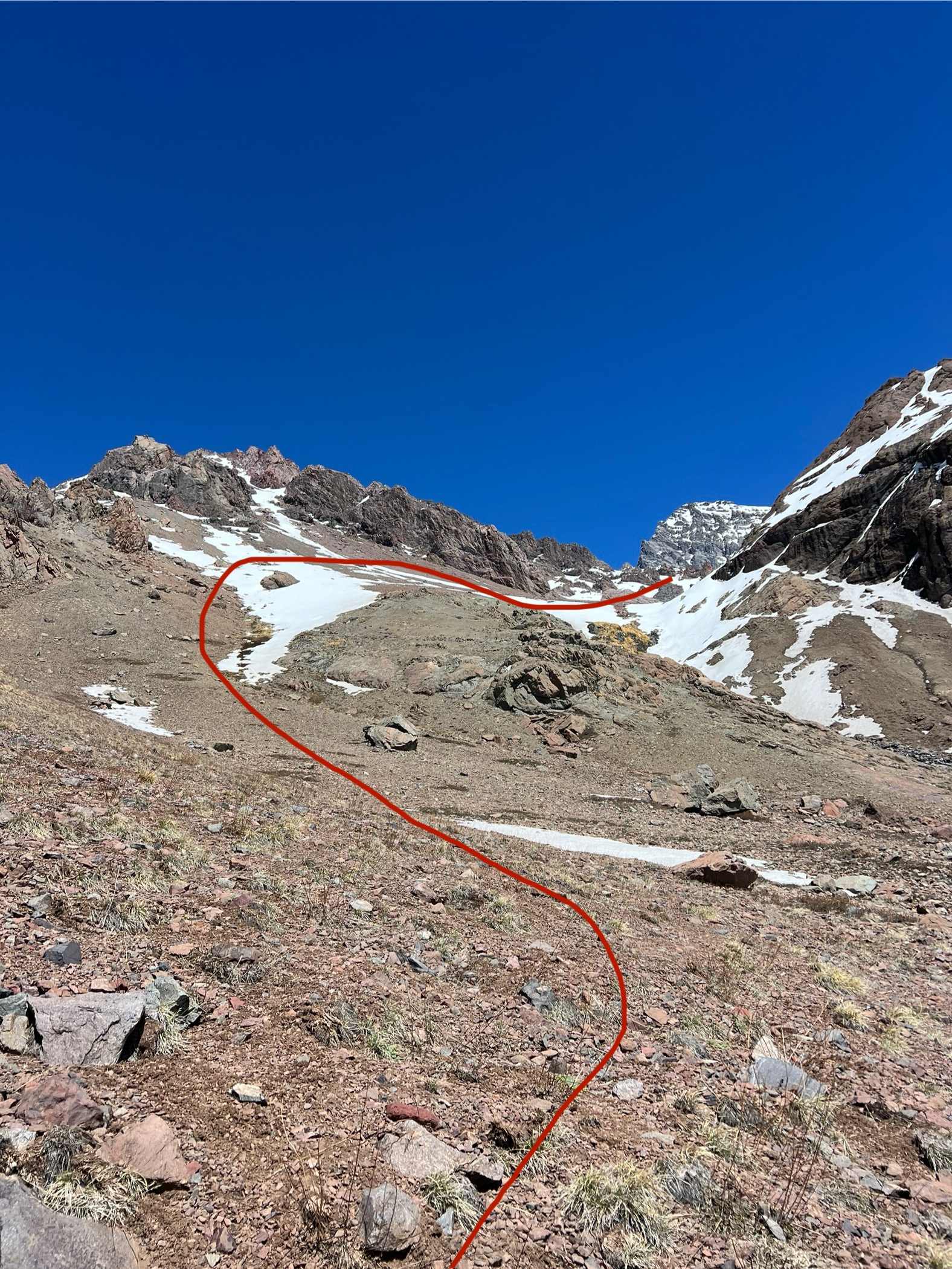 No se sigue hasta el refugio, sino que antes de llegar a él debe doblar hacia la izquierda (oeste) y comenzar a ascender Ver foto 3. Se continúa subiendo por la izquierda del arroyo Caracoles y se ve que el camino comienza a curvarse hacia la derecha (norte), entrando en una especie de cajón para ingresar así a la quebrada Caracoles Ver foto 4. Continuar por esta quebrada, traverseando algunos metros de piedra y tierra Ver foto 5, donde ya se ve el Pico Gótico de fondo. Se continua hasta llegar a una planicie a los 3670m donde se puede acampar. Ésta se encuentra muy cerca del arroyo, así que es posible obtener agua para beber y cocinar.