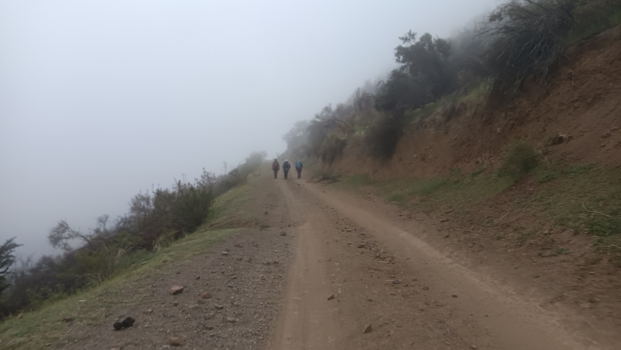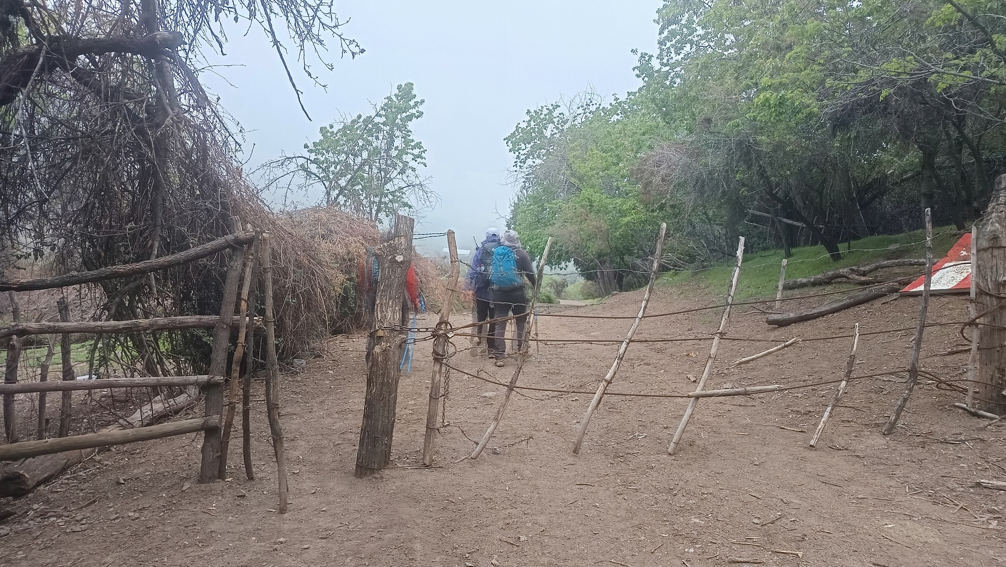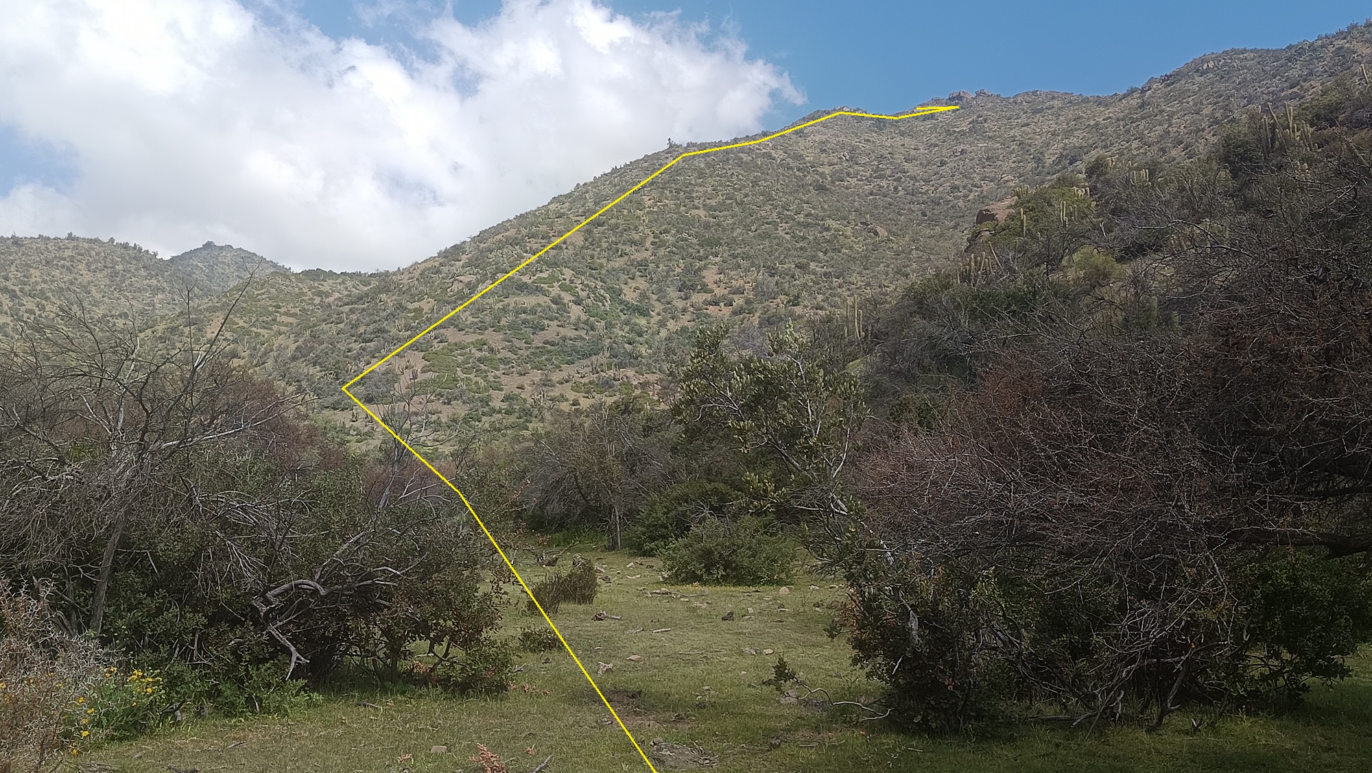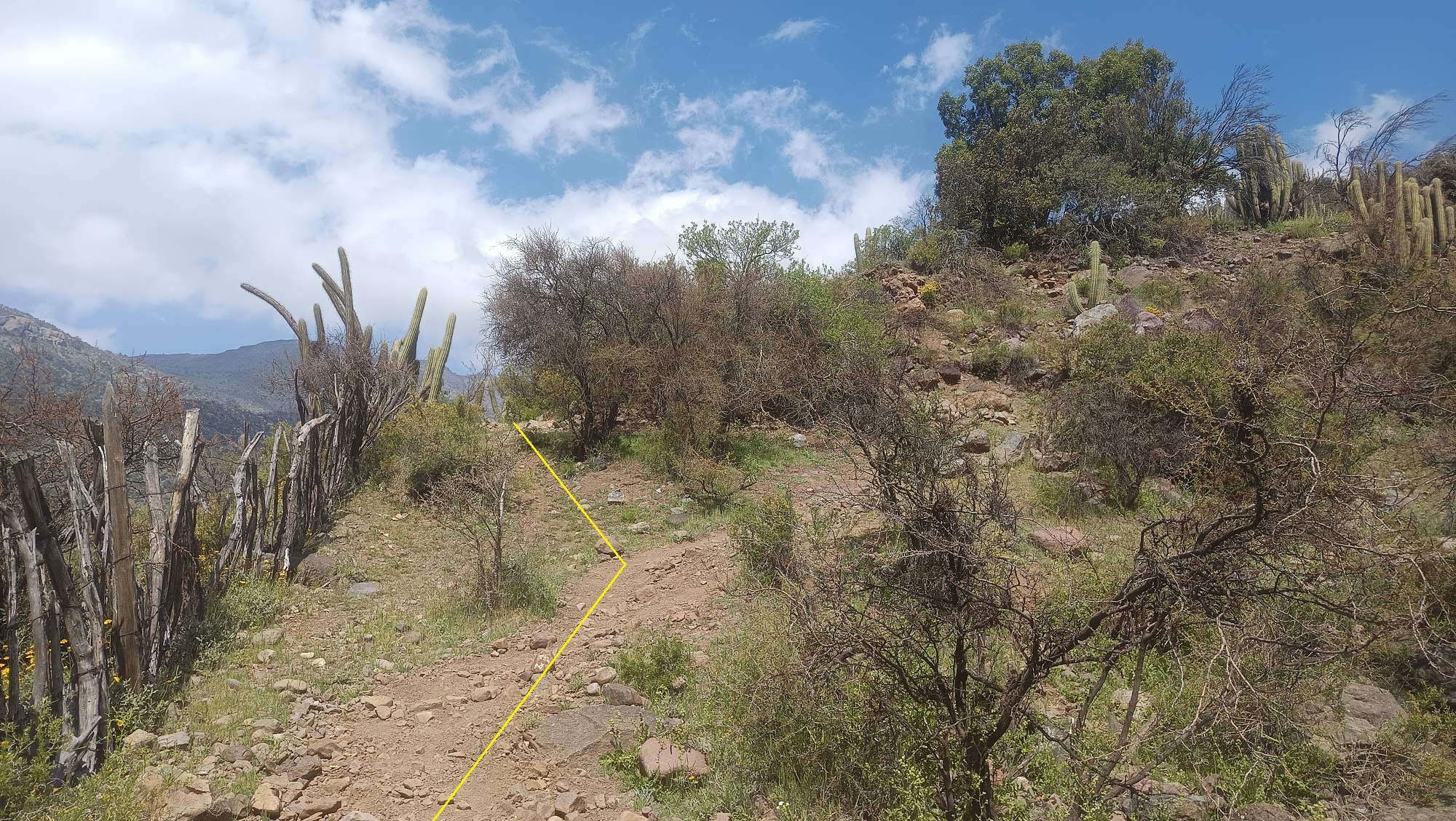 Tras el cruce, nace un sendero que continúa a la base de la montaña, este sendero es el que lleva a la travesía desde La Ermita al Manzano y se interna por el cajón del estero Covarrubias, sin embargo, no se debe continuar por este, sino que por un sendero que se desvía al sur justo en este punto, a un costado de un cerco que hay en el lugar (Ver foto 6).