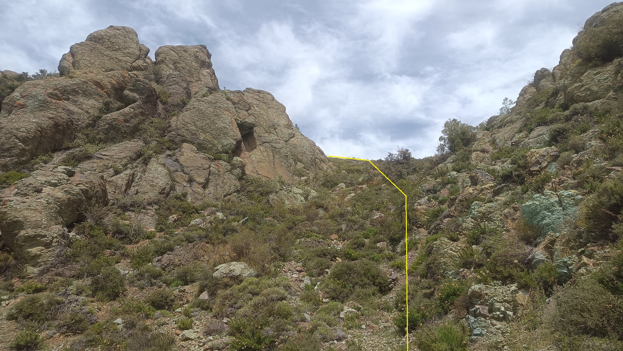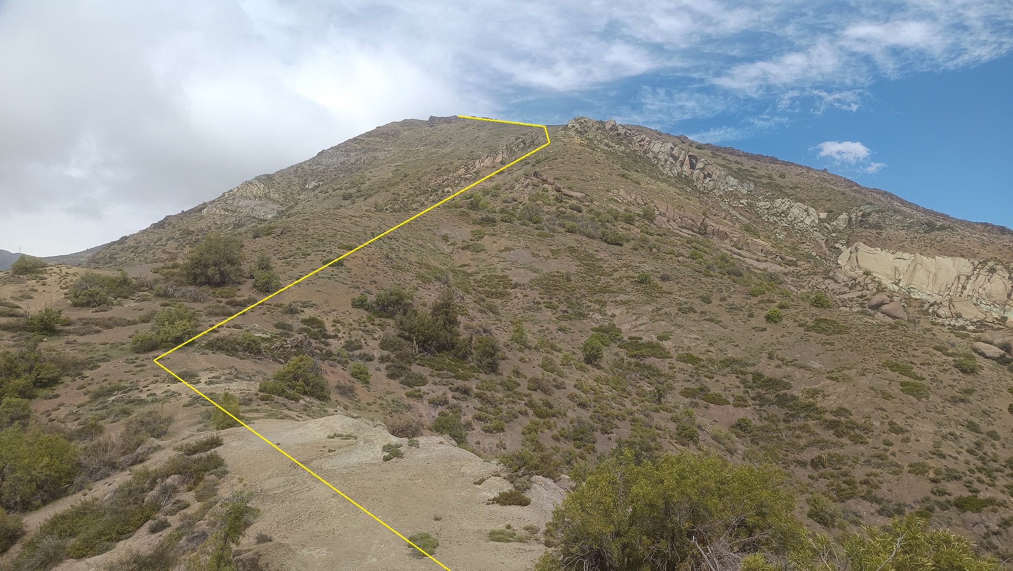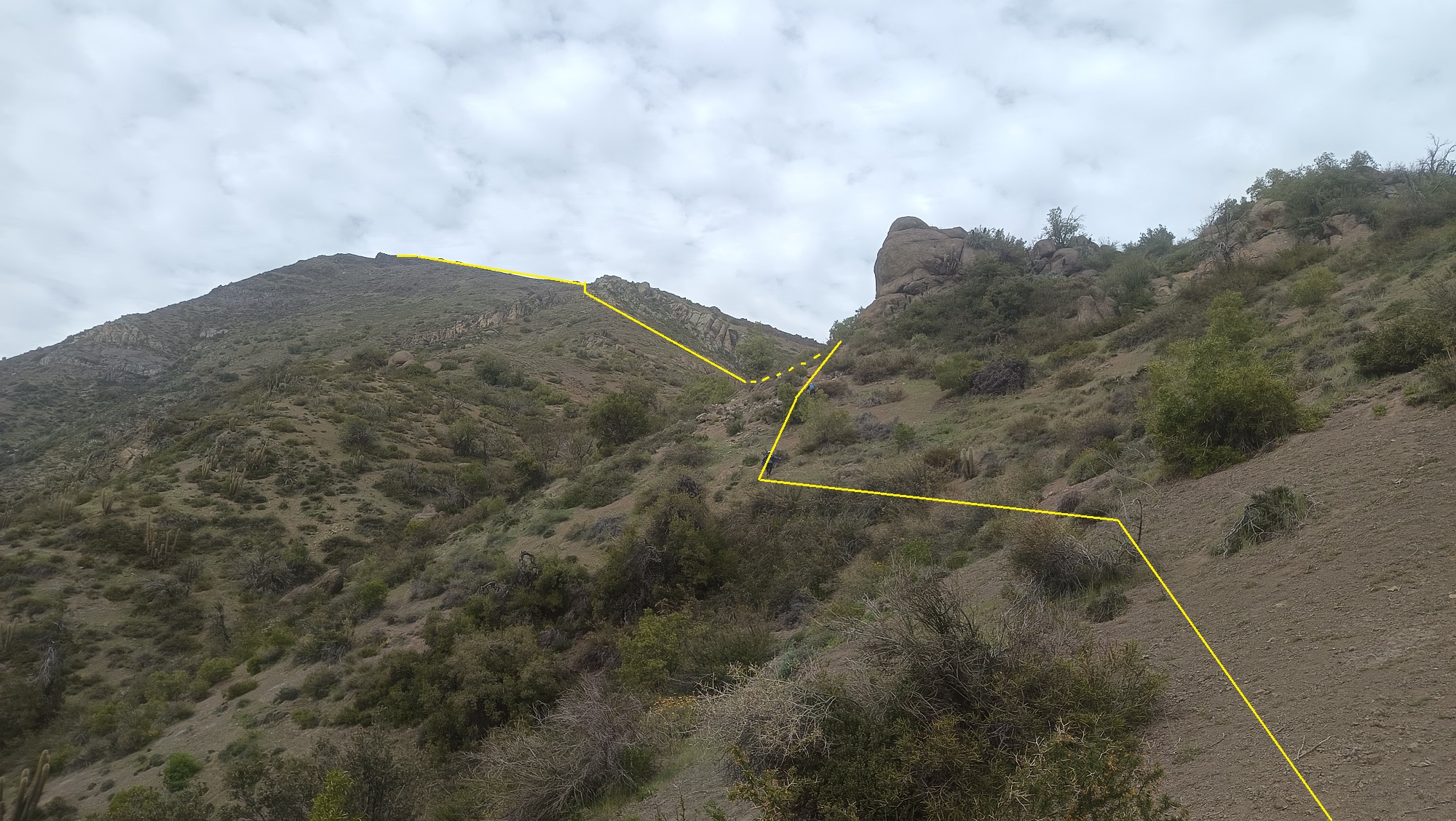 Se avanza al sur a través de un marcado sendero, pero a poco andar este se abandona y se debe acceder hacia los 1400m al filo norte del cerro y progresar a través de este por el lugar más cómodo a través de la vegetación, si bien existe una huella, esta es muy difusa, por lo que no merece esfuerzo seguirla. Hacia los 1700m, bajo una formación rocosa que aparece en el filo, se debe hacer un traverse internándose a una quebrada hacia el este, ganando altura a través de esta (Ver foto 8). Se sigue por la quebrada al sur, para retomar el filo hacia poco antes de los 1900m (Ver foto 9).