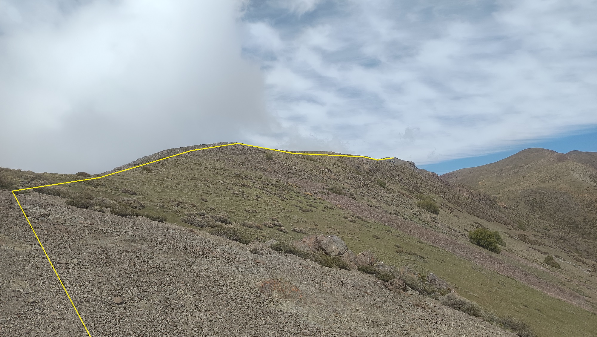 Retomado el filo, se avanza por este hacia el sur. Poco antes de los 2100m se debe atravesar una breve canaleta, tras la cual se logra llegar al filo somital (Ver foto 10). Ya en este punto, se continúa el avance con dirección a la cumbre (Ver foto 11) (Ver foto 12), que se encuentra marcada por un monolito de rocas (Ver foto 13).