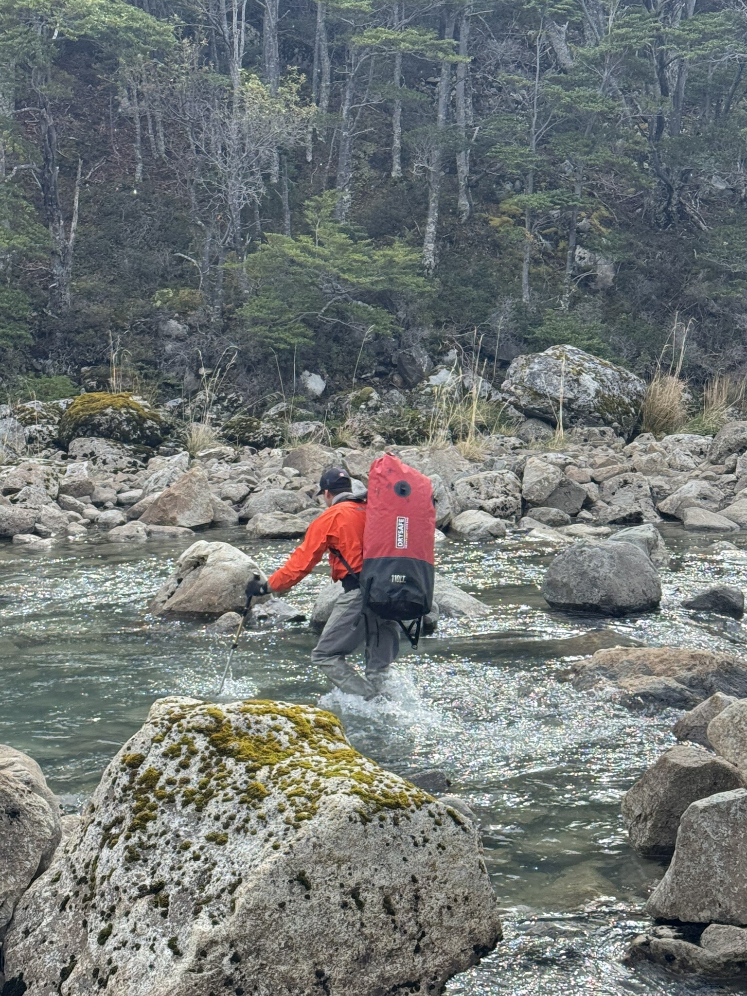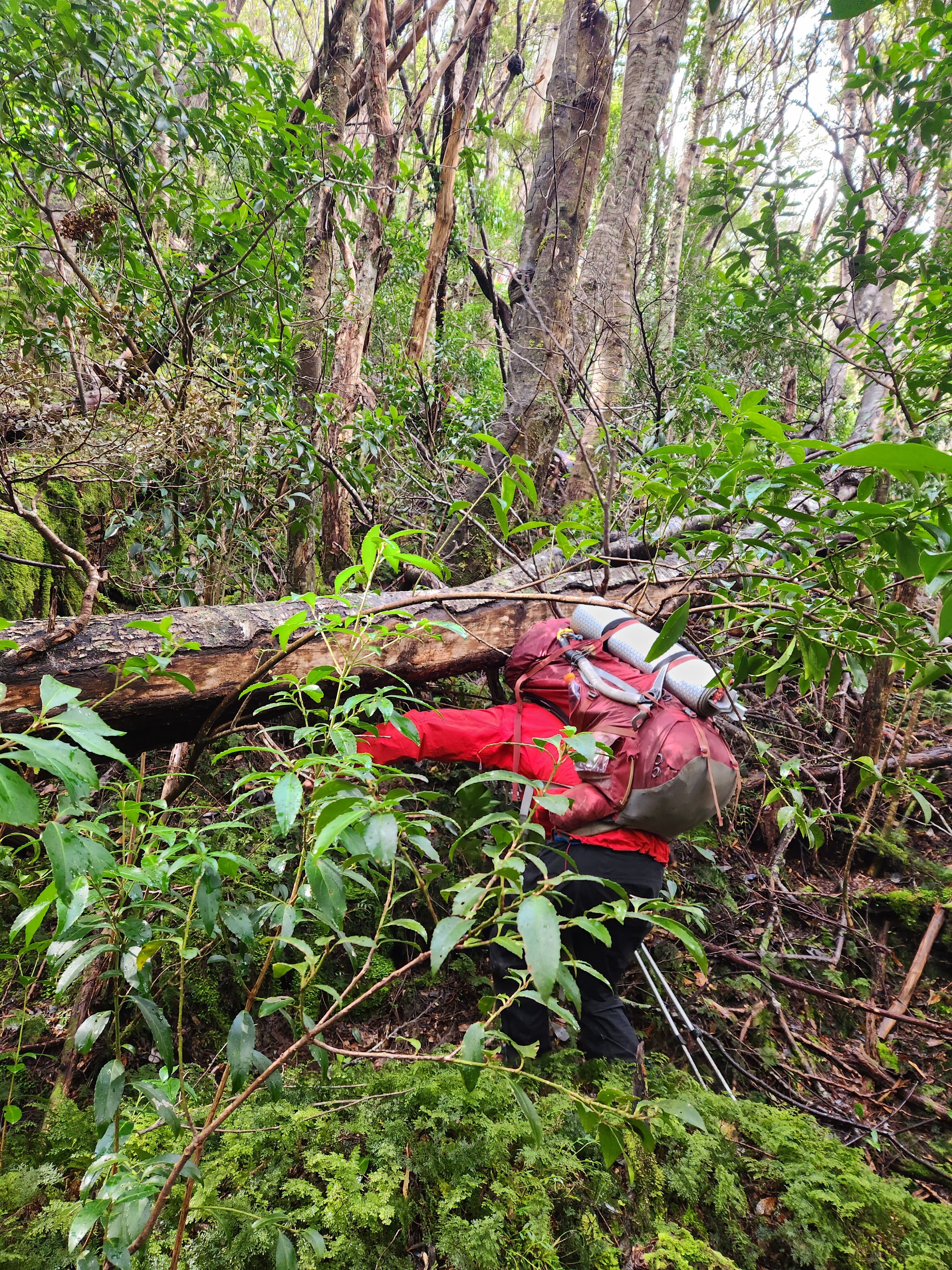 Tras realizar el cruce del río inicial (Ver foto 1), la ruta se interna en un bosque denso donde es fundamental localizar un antiguo sendero de Conaf marcado con cintas naranjas; aunque la huella es intermitente y difícil de seguir, es ideal mantenerse en ella —apoyándose en el track de GPS— ahorrando un esfuerzo considerable frente a la vegetación cerrada (Ver foto 2). Se recomienda evitar la orilla del fiordo, ya que el terreno desaparece rápidamente obligando a mojarse los pies, siendo la ruta del bosque la opción más eficiente.
