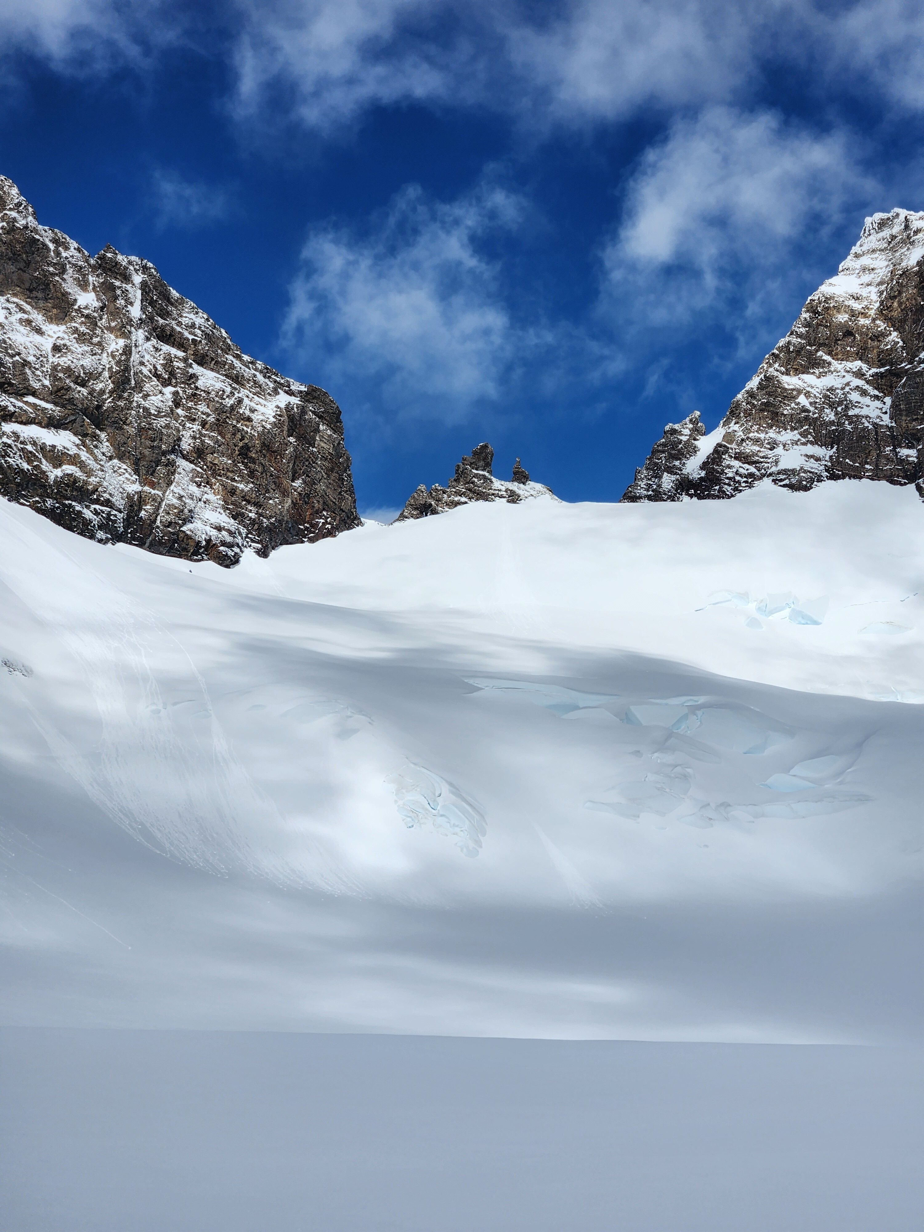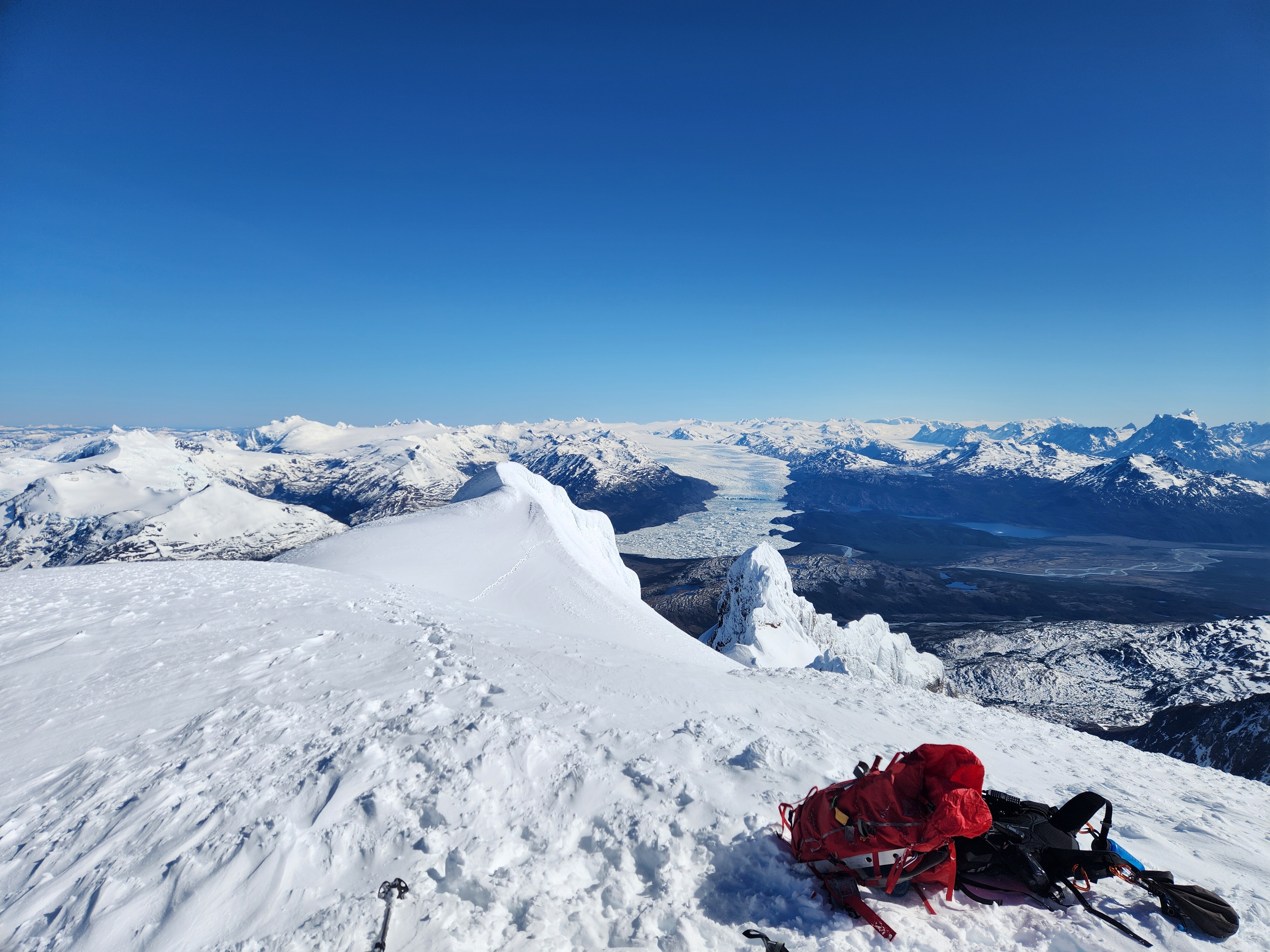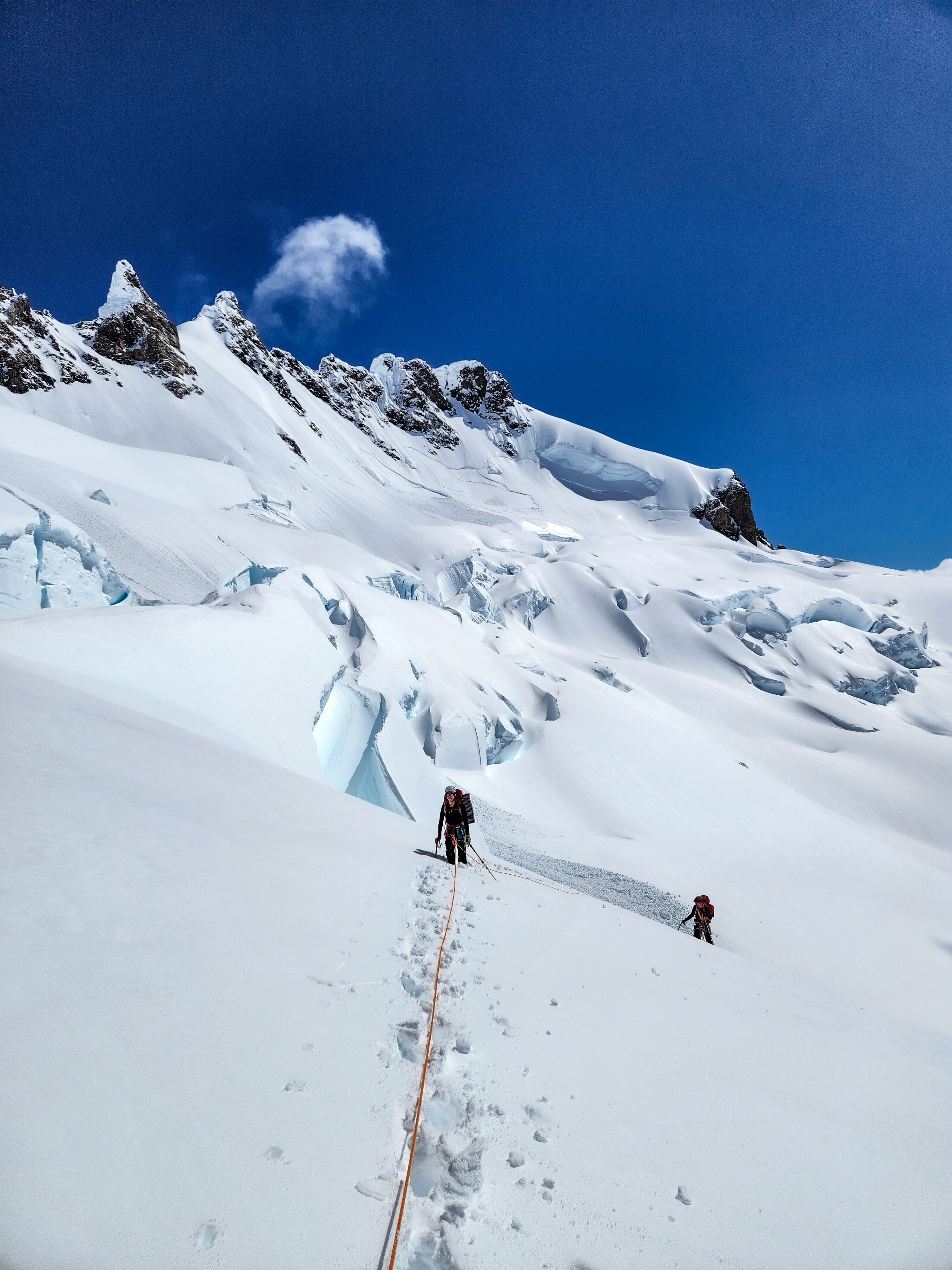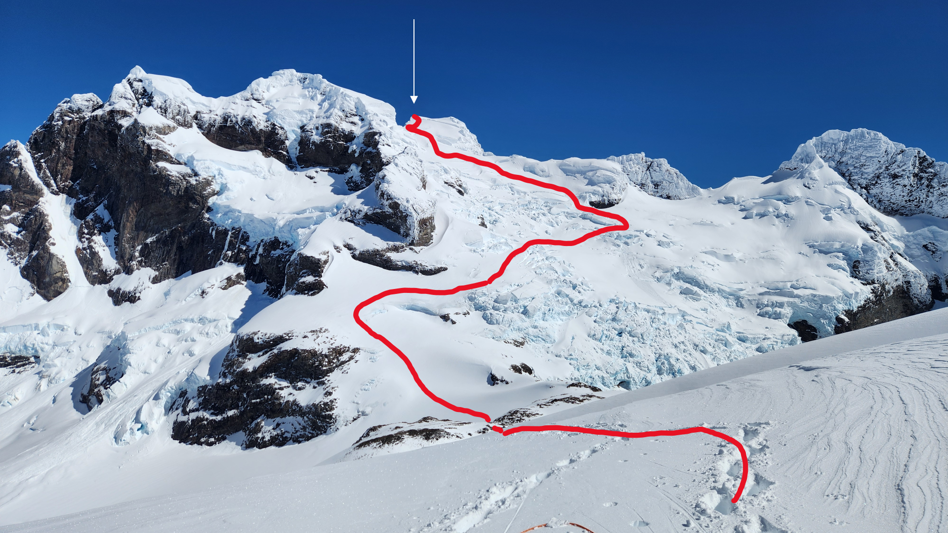 La jornada de ataque a cumbre debe iniciarse muy temprano (aprox. 2:00 a.m.) para aprovechar el frío y la firmeza de los puentes de nieve, además de evitar el riesgo de caída de seracs (Ver foto 6). La ruta aquí descrita es una sugerencia según el estado en que se encontró el glaciar, pero esto podría cambiar, debido a la dinámica del mismo. Desde el C2, teniendo una visión de la parte alta de la montaña en su totalidad, se debe descender unos 200m de desnivel, avanzando unos 300m aprox. en dirección Oeste, evitando ir en dirección Sur, para no caer en las grietas. Posterior a esto, sí se puede ir en línea recta (dirección Suroeste) durante 1km hasta toparse con una pared de roca, momento de girar hacia el Oeste nuevamente, ganando altura y meterse de lleno en el glaciar para ir sorteando las evidentes grietas, como se estime conveniente, hasta los 1700m (Ver foto 7). Desde ese punto, nuevamente retomar la dirección Sur (Ver foto 8), donde las grietas se reducen considerablemente y la pendiente puede llegar hasta los 40°, sin representar ninguna dificultad técnica. Para la sección final, se debe rodear una falsa cumbre por el Sureste, para en los últimos cientos de metros, escoger las distintas vías existentes para llegar a la cumbre (Ver foto 9).