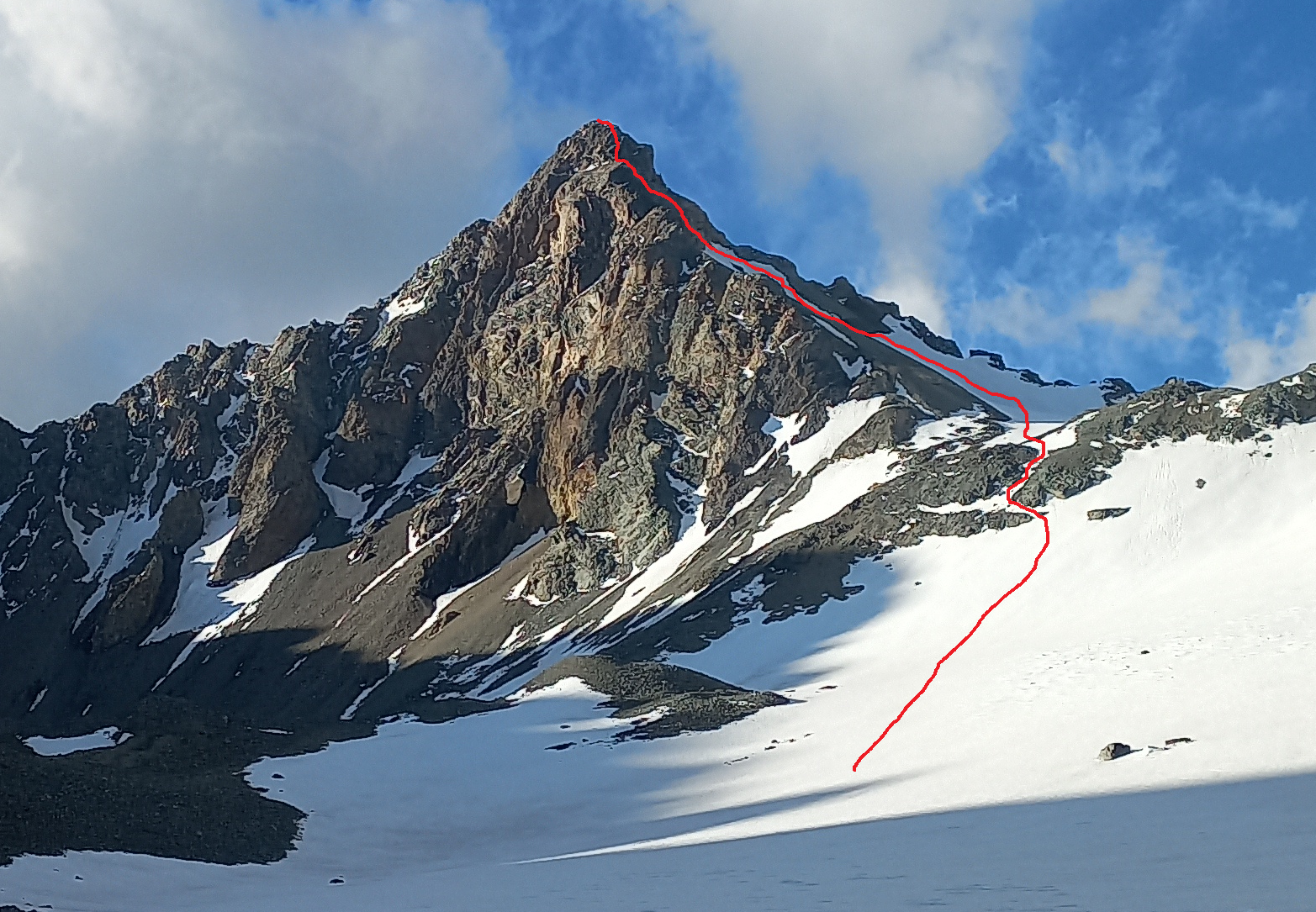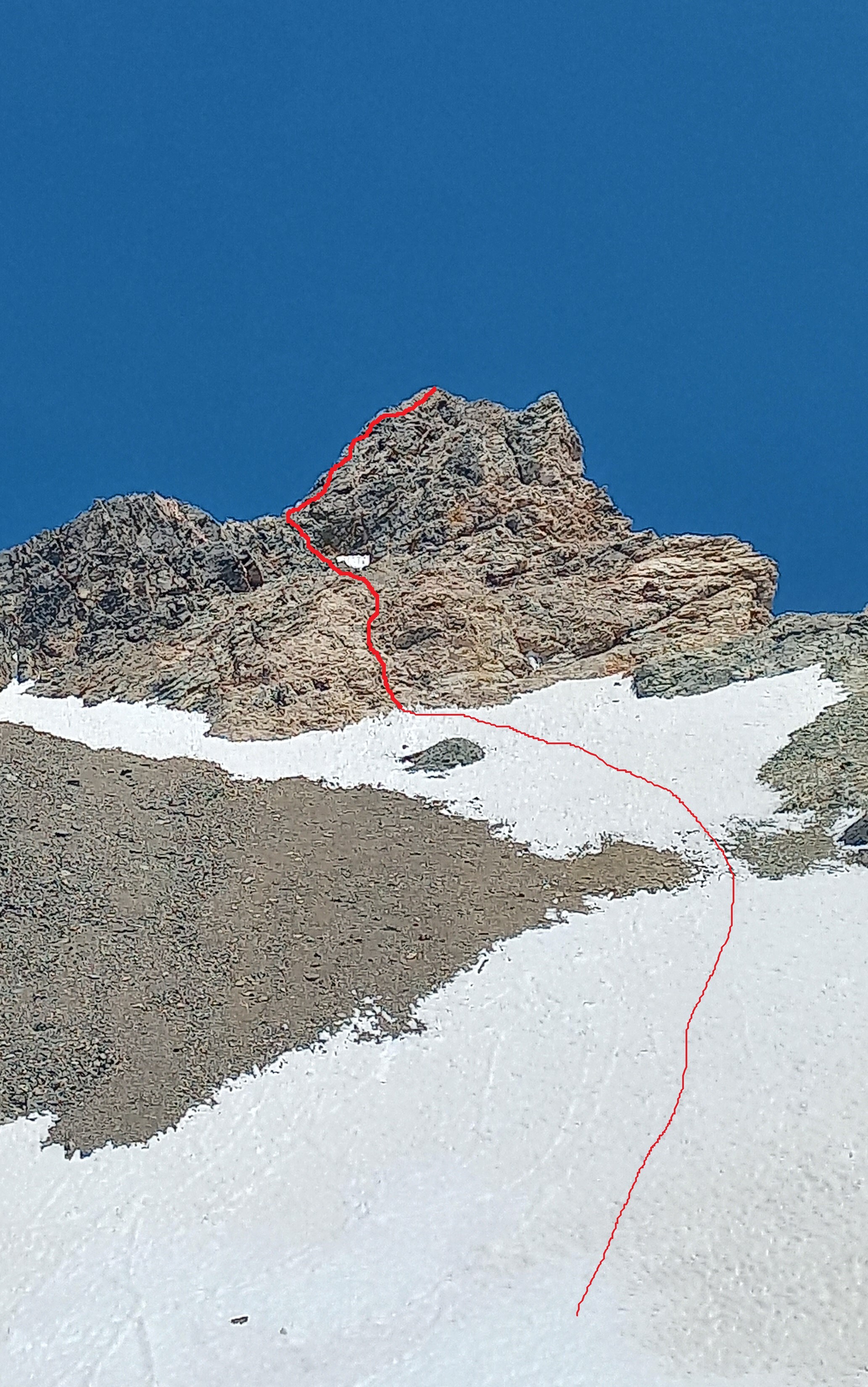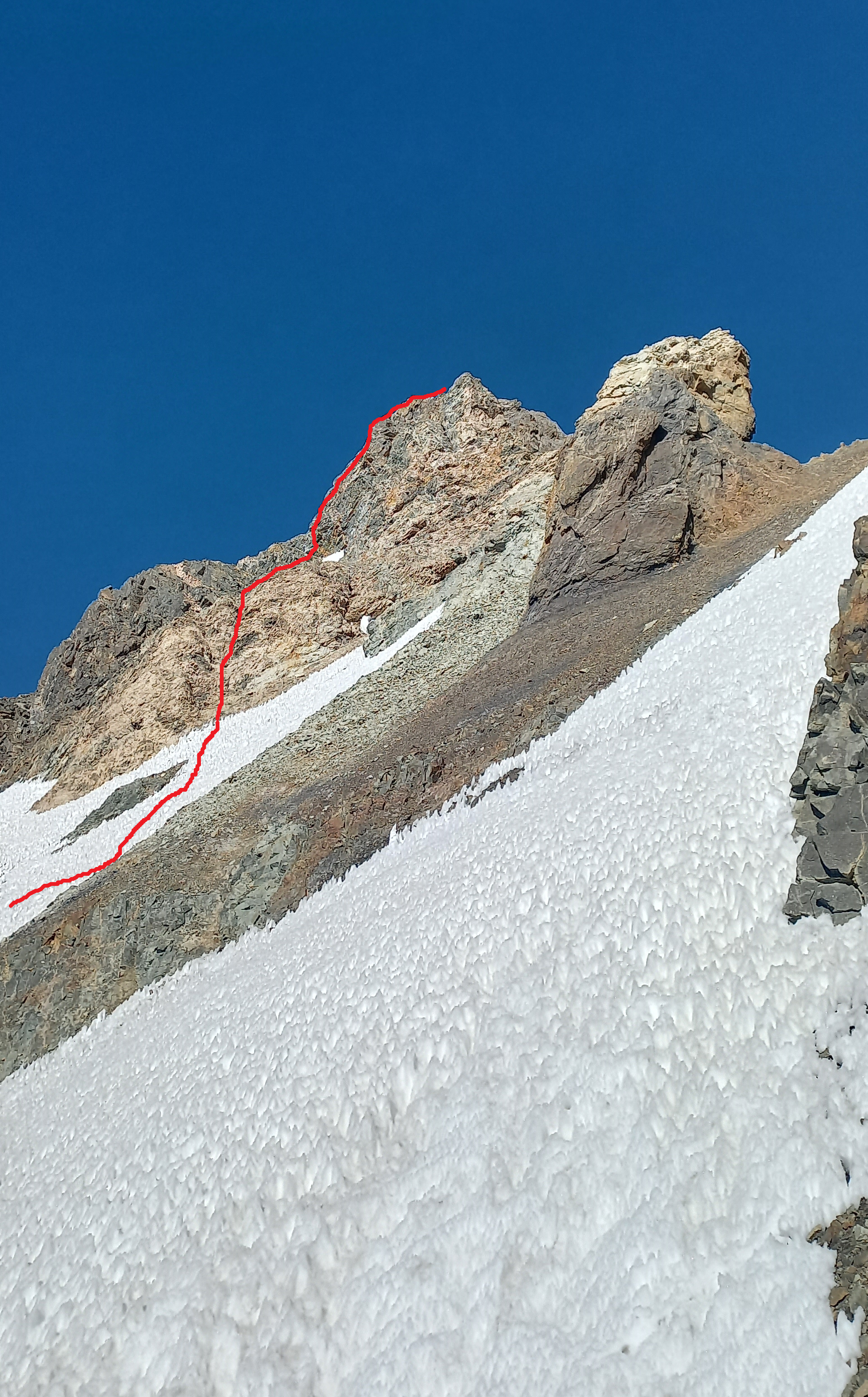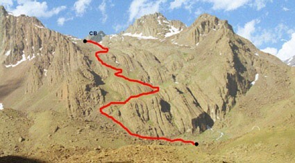Desde el campo base Ver foto 2 se debe aproximar por el glaciar/nevero Ver foto 3 hasta llegar al torreón de roca del cerro Ver foto 4 Ver foto 5, a una altitud de 4500m aproximadamente. Este tramo toma 1½h. Ya en la base de la roca se puede ver la primera chimenea donde empieza la sección de roca Ver foto 6.