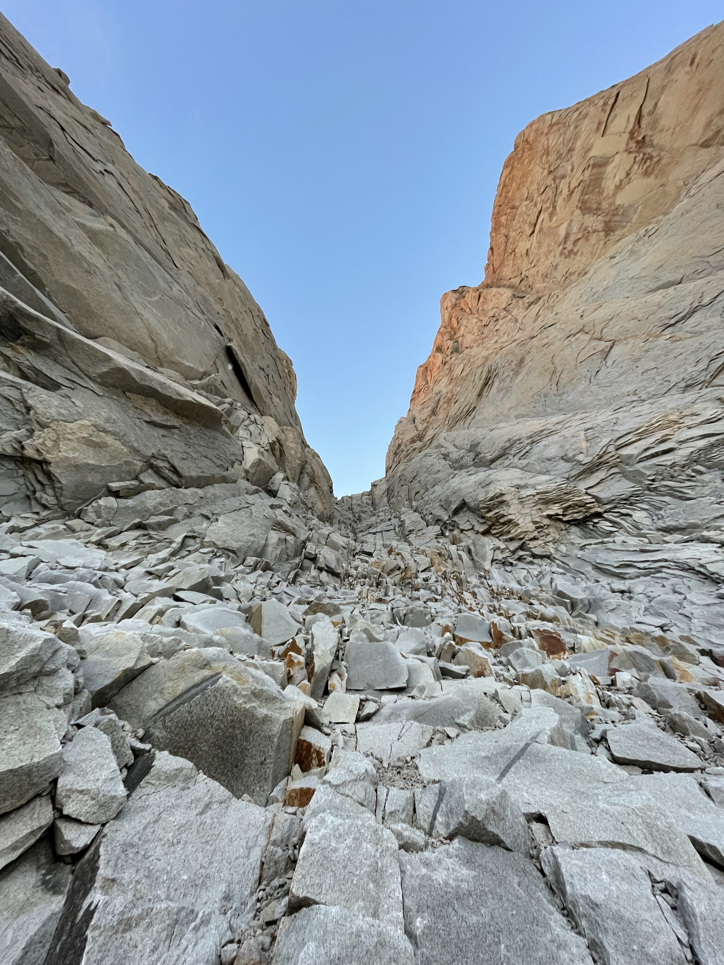 - L12 - 45 m: comienza con una escalada de III grado en dirección a un canalón con un gran bloque empotrado. Superar el bloque y seguir por el canalón hasta alcanzar el hombro (vivac) Ver foto 8.