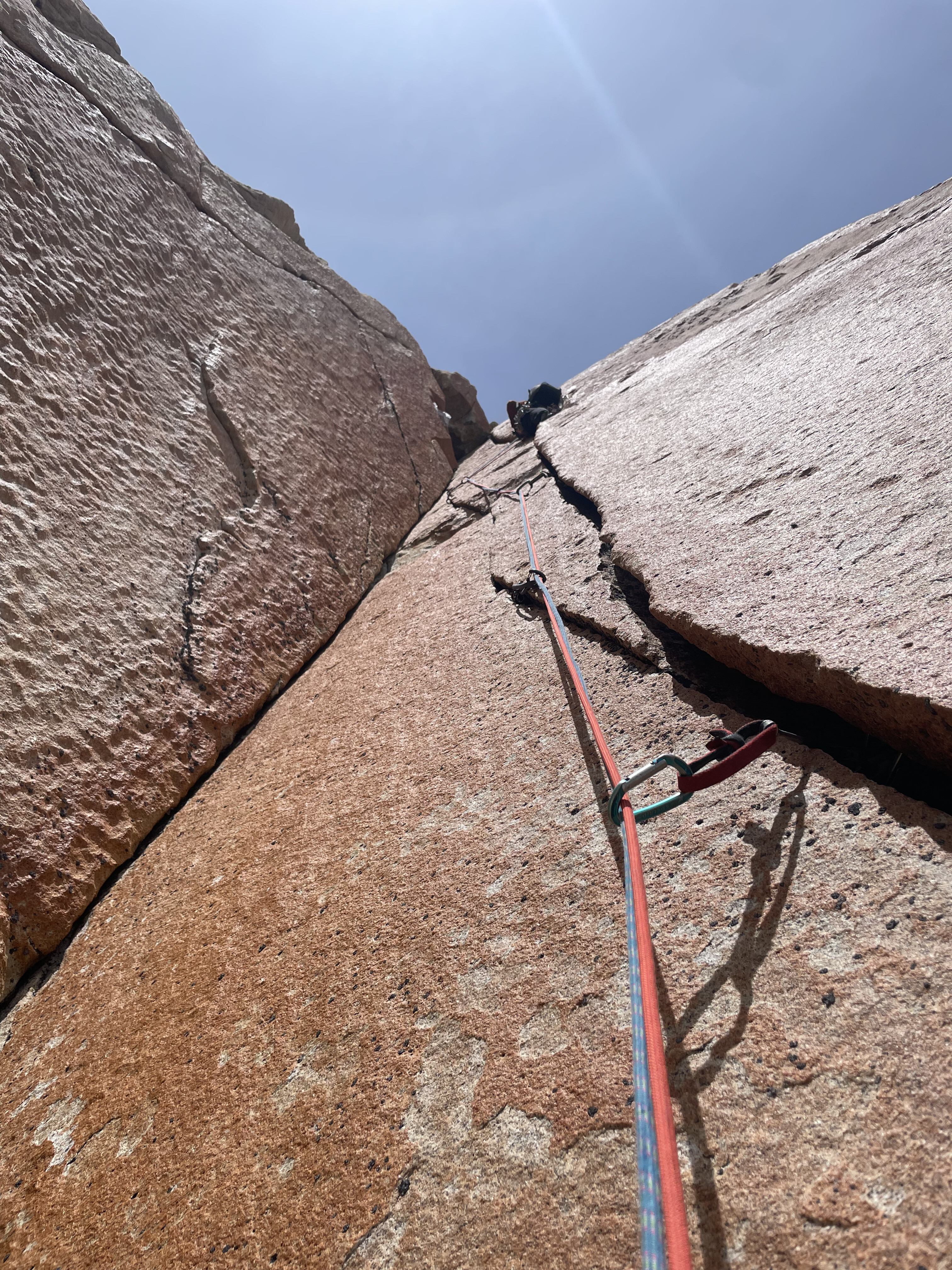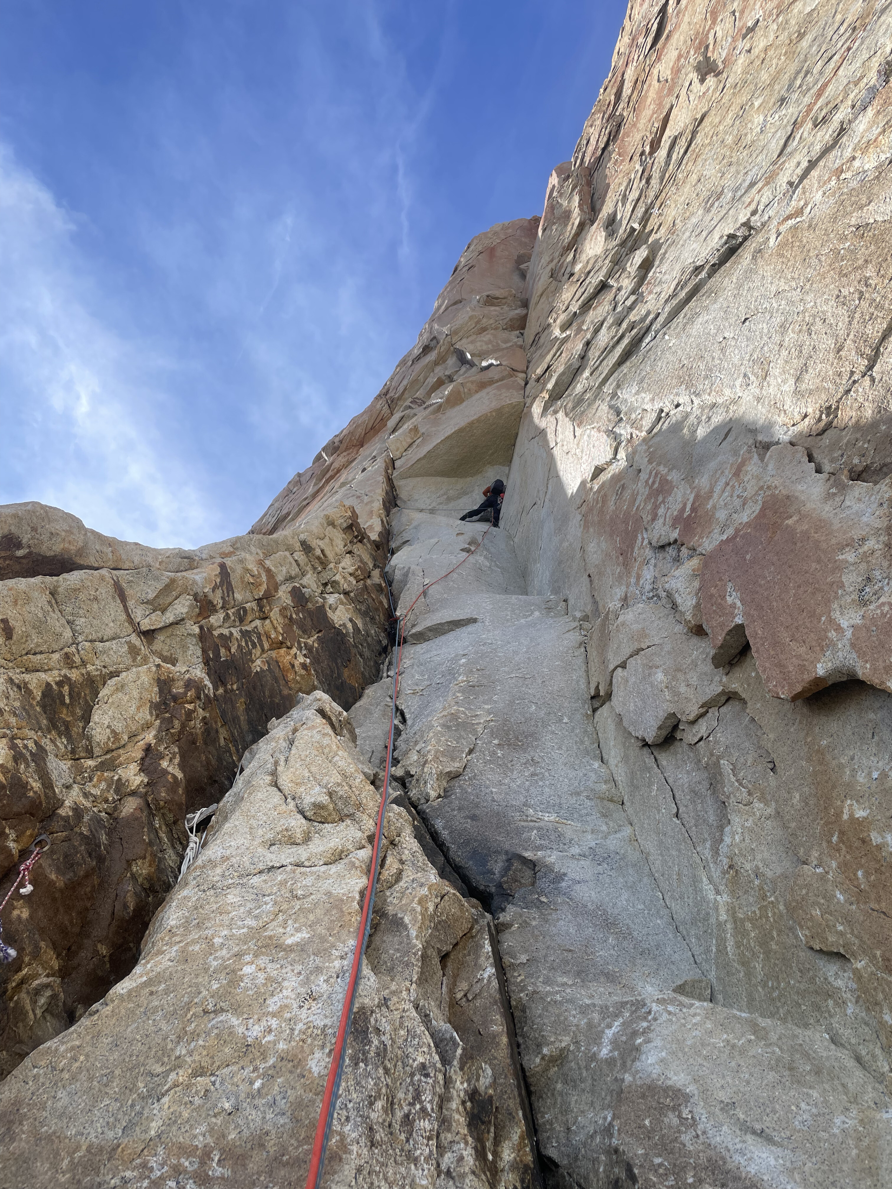 - L7 - 45 m: sale desde la reunión vertical con pasos de 5.10a/b para montarse en una terraza inclinada. En este punto, comienza una placa sellada con una evidente fisura de dedos por la cual se debe progresar. Proteger con números pequeños (A1) hasta alcanzar una terraza superior, donde la fisura se ensancha y se puede proteger con números algo más grandes (A1). Finalmente, sortear un paso expuesto por fuera de la fisura hacia la izquierda, para alcanzar el inicio del Diedro Rojo.