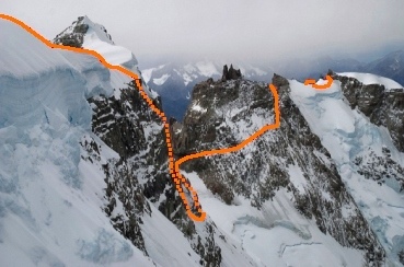 Subir por la gran canaleta de hielo cuya pendiente promedio bordea los 60°. Luego de 3h se alcanza el espolón norte desde donde hay buenas vistas a Campo de Hielo Sur Ver foto 4. La cumbre del cerro se presenta aun lejos en el horizonte hacia el Sur Ver foto 3. Para continuar, se deberá atravesar horizontalmente por la cara oeste, hasta llegar a un paso angosto en la arista. Es necesario rapelar 2 largos hacia la otra cara (sureste) y atravesar horizontalmente en nieve hasta un lugar amplio apto para vivaquear (4h desde la arista). Continuar atravesando la pared este entre pasos de roca vertical de IV° Ver foto 5 hasta llegar debajo de una cascada de hielo. Esta se escala en 2 largos de hielo (WI4+) y 2 de mixto (M5), y da paso a la cresta cumbrera donde el terreno es de fácil tránsito hasta la cumbre (aprox. 5h desde el sector de vivac eventual).