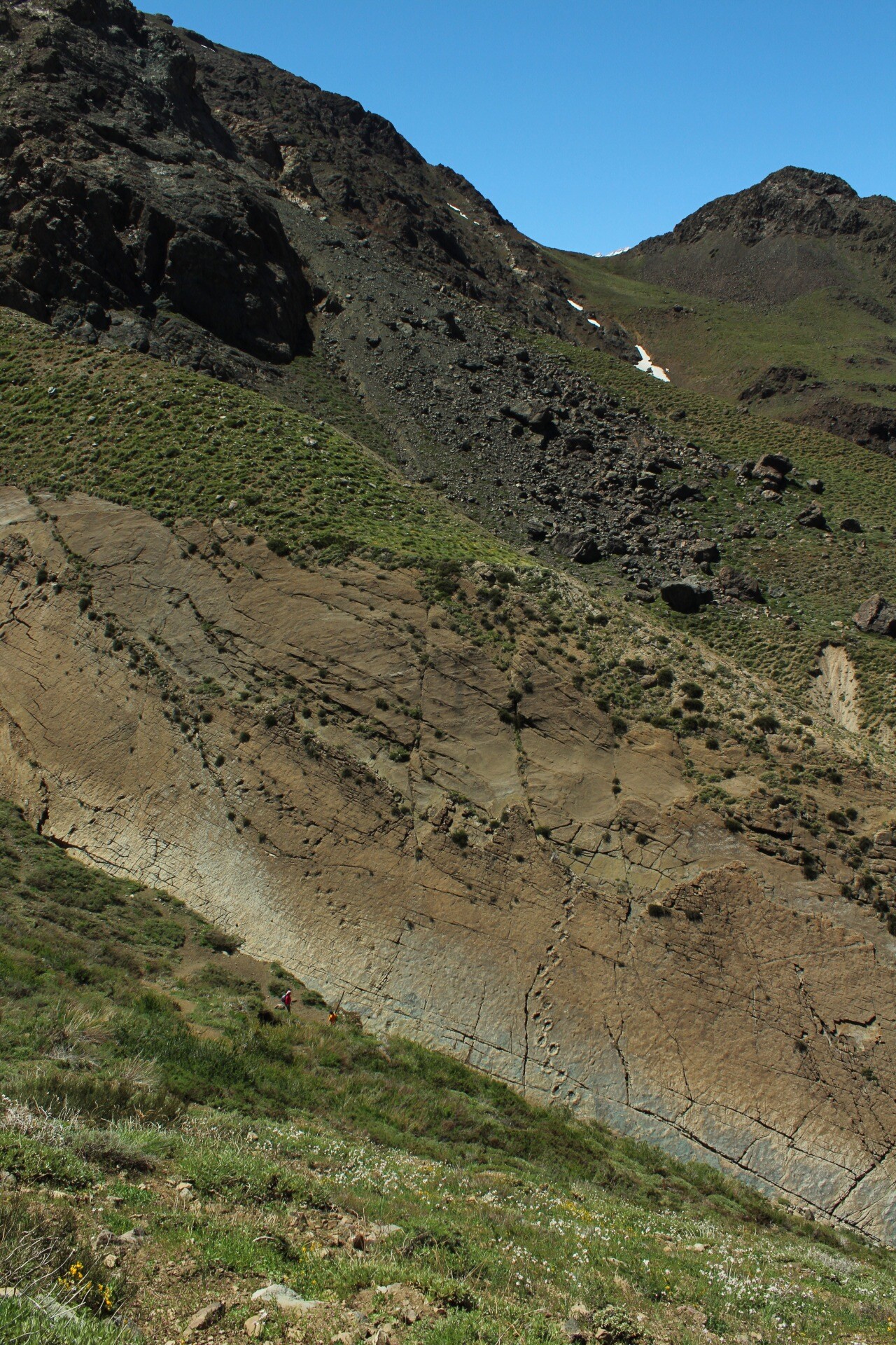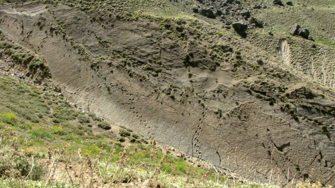 Al final del zigzag la pendiente aminora. Un letrero con información geológica de la zona marca este punto (1km desde Termas del Flaco). Desde el letrero hay continuar por el sendero por cerca de 500m, rodeando la ladera por su costado sur Ver foto 2, lo que entrega buenas panorámicas del pueblo. Continuar por el sendero hasta alcanzar el mirador de la placa donde se encuentran las huellas de dinosaurios Ver foto 3 y Ver foto 4.