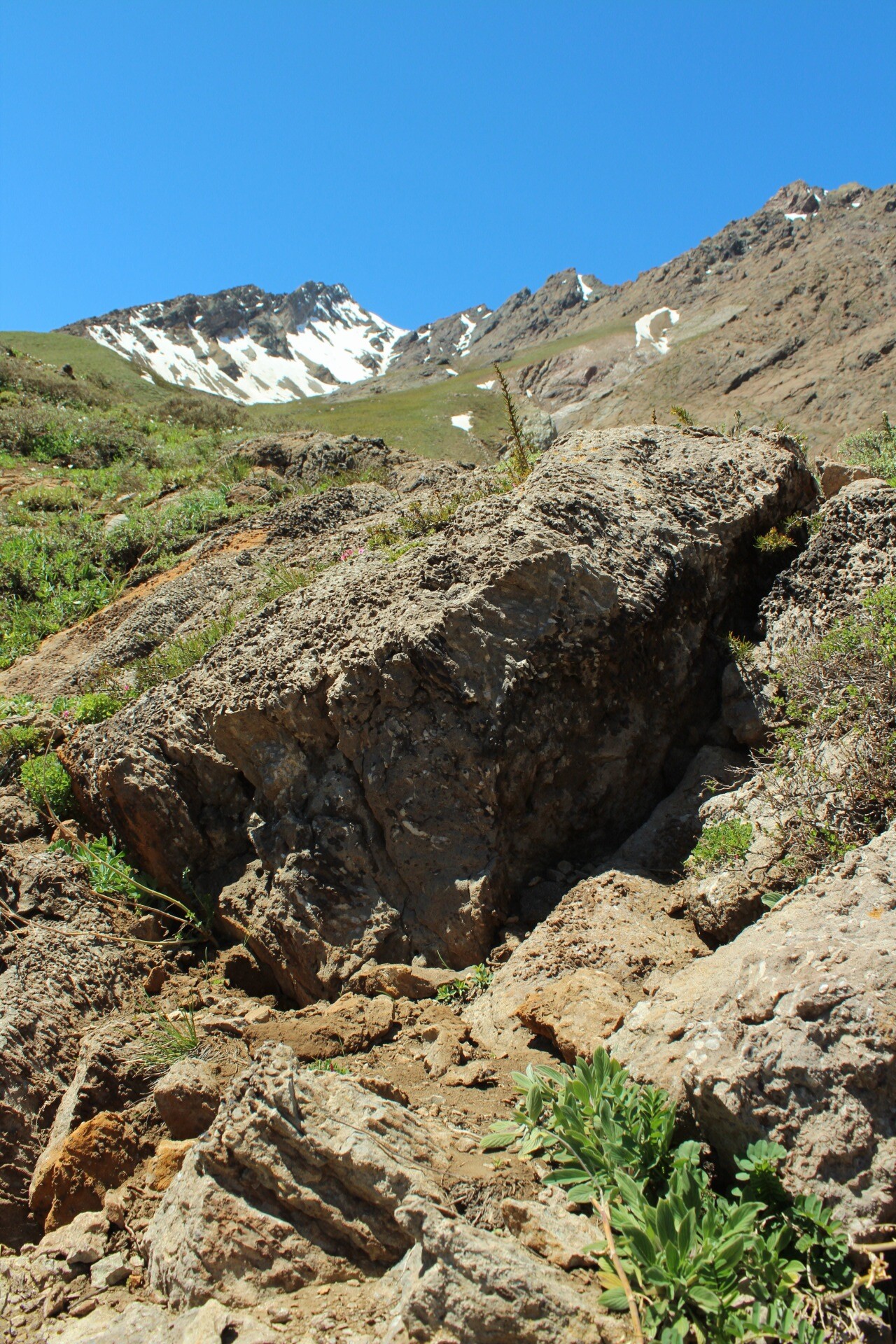 Luego de unos 15 a 25 minutos adicionales, se alcanza el sector donde es posible observar fósiles marinos Ver foto 5, como corales, amonites y conchillas, evidenciando el antiguo origen marino del lugar Ver foto 6, Ver foto 7, Ver foto 8 y Ver foto 9. Tras la visita, el retorno se realiza por el mismo camino, descendiendo hacia el pueblo de Termas del Flaco. El recorrido puede realizarse en media jornada, sin dificultades técnicas, pero considerando la exposición al sol durante gran parte del recorrido.