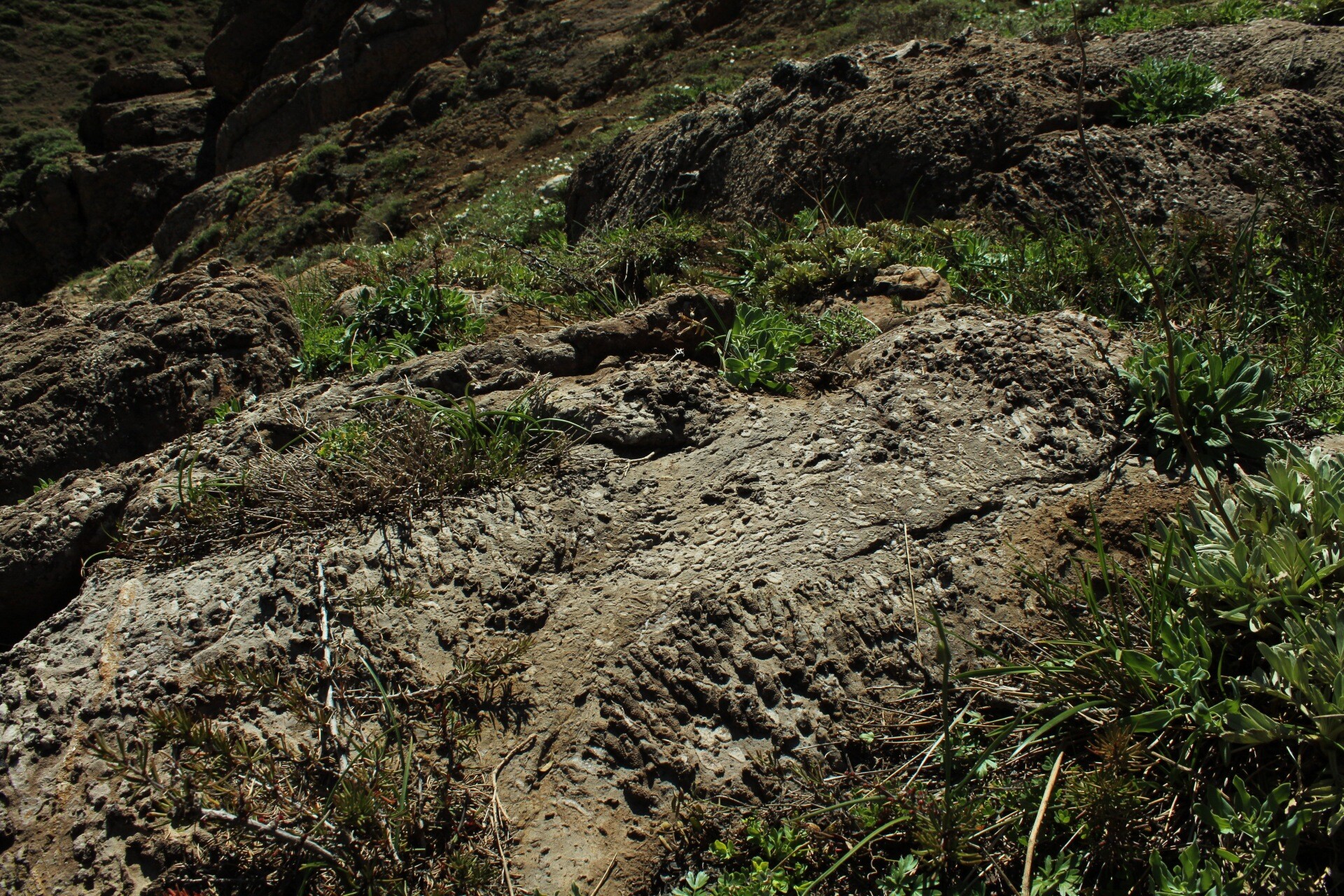 Desde este punto, es posible continuar el ascenso hacia los fósiles de corales, avanzando hacia el noreste. El sendero deja de ser tan evidente, pero la ruta se puede seguir observando la pendiente y las formaciones del terreno, avanzando entre lomas de vegetación baja.