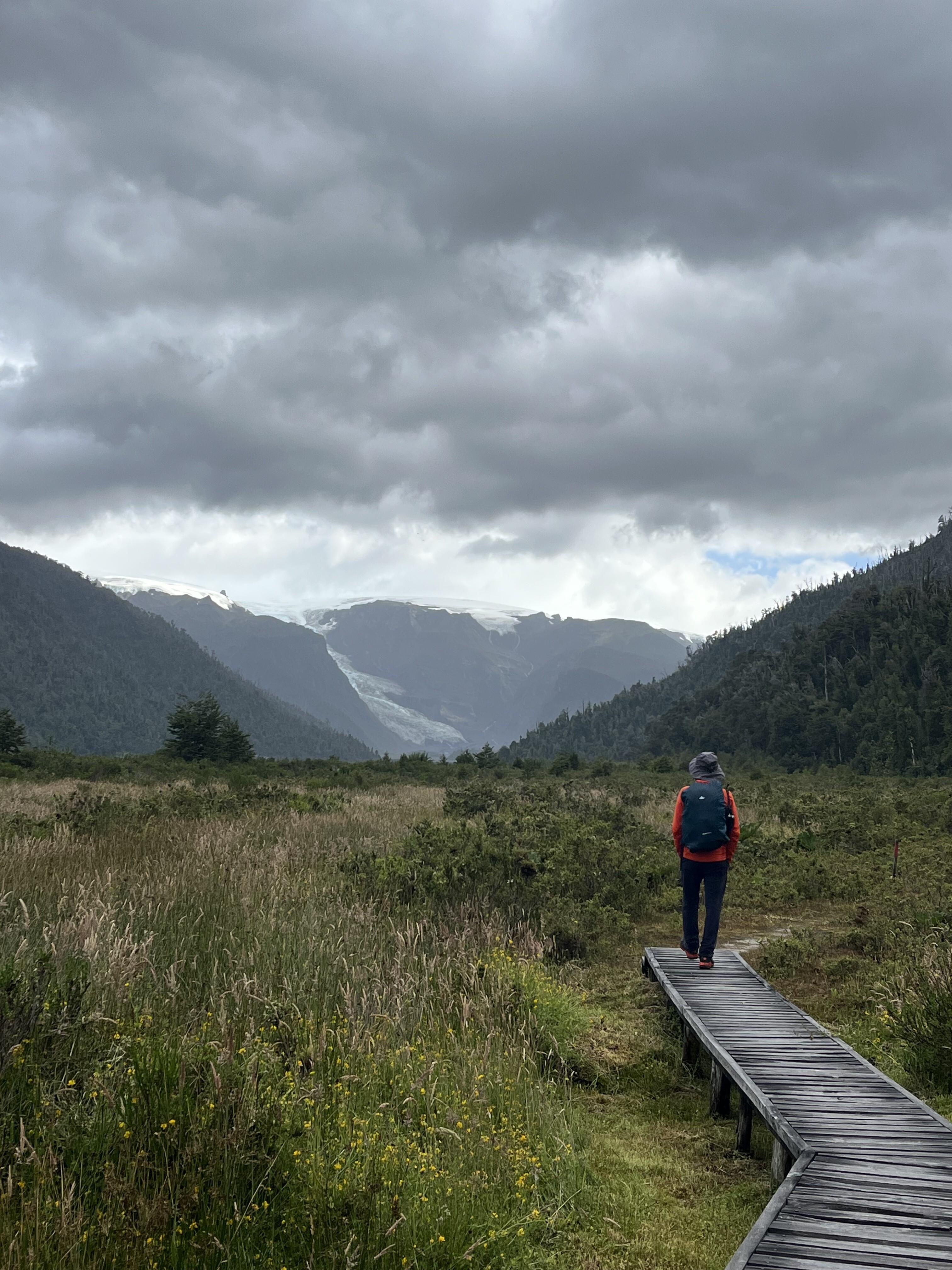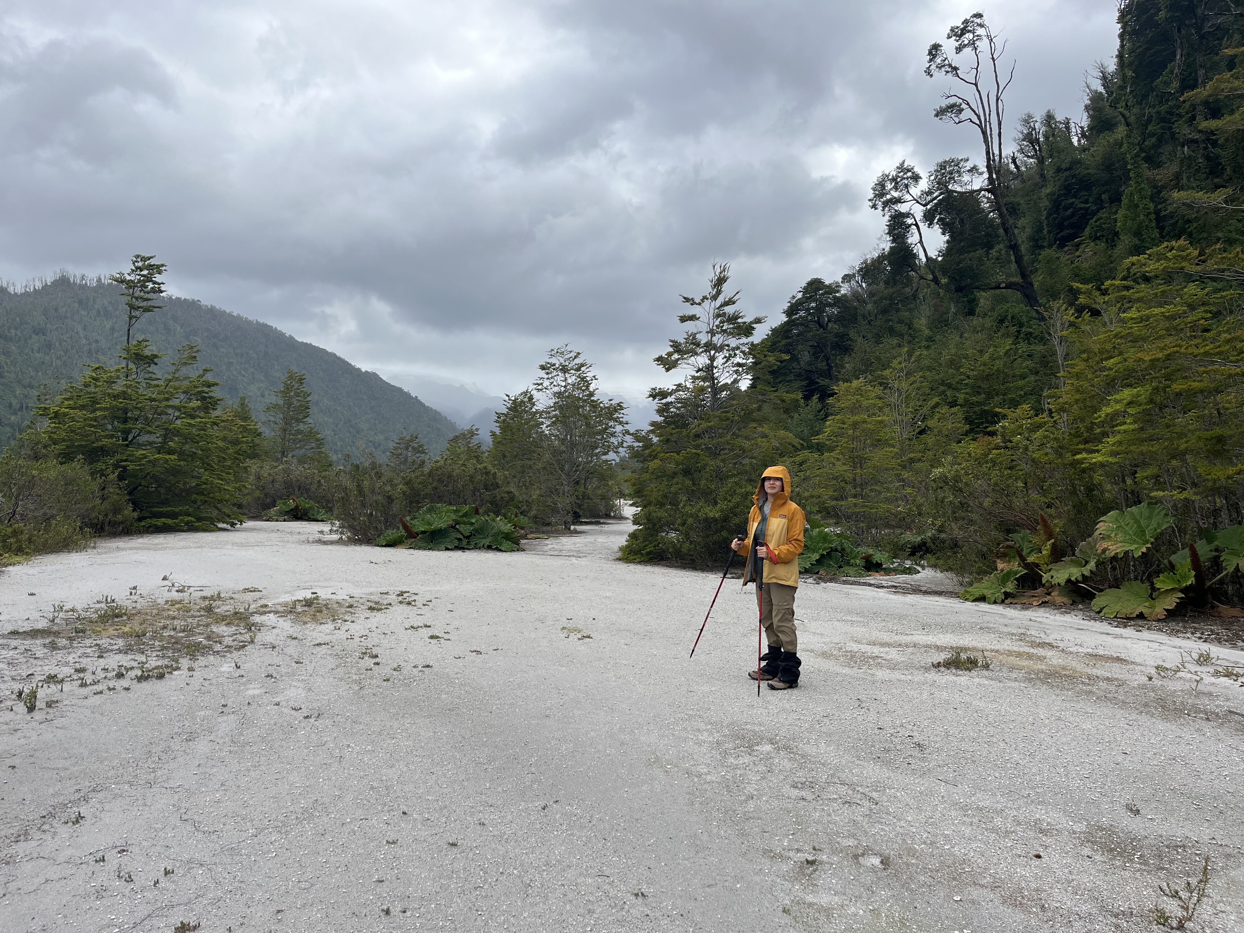 Superado el bosque, el sendero atraviesa unas pasarelas Ver foto 3 y luego se mantiene siempre en dirección norte internándose en el valle glaciar. Primero se atravesaran grandes extensiones de terreno cubiertas de nalcas y sobre un suelo que llama la atención por su blancura Ver foto 4, hasta que tras cerca de 4km desde iniciado el sendero propiamente tal, la ruta gira levemente hacia el este y se interna en el margen del bosque (394m) para continuar avanzando a través de un estrecho sendero con algunas escaleras y arboles caídos que comienza a avanzar junto al río Amarillo.