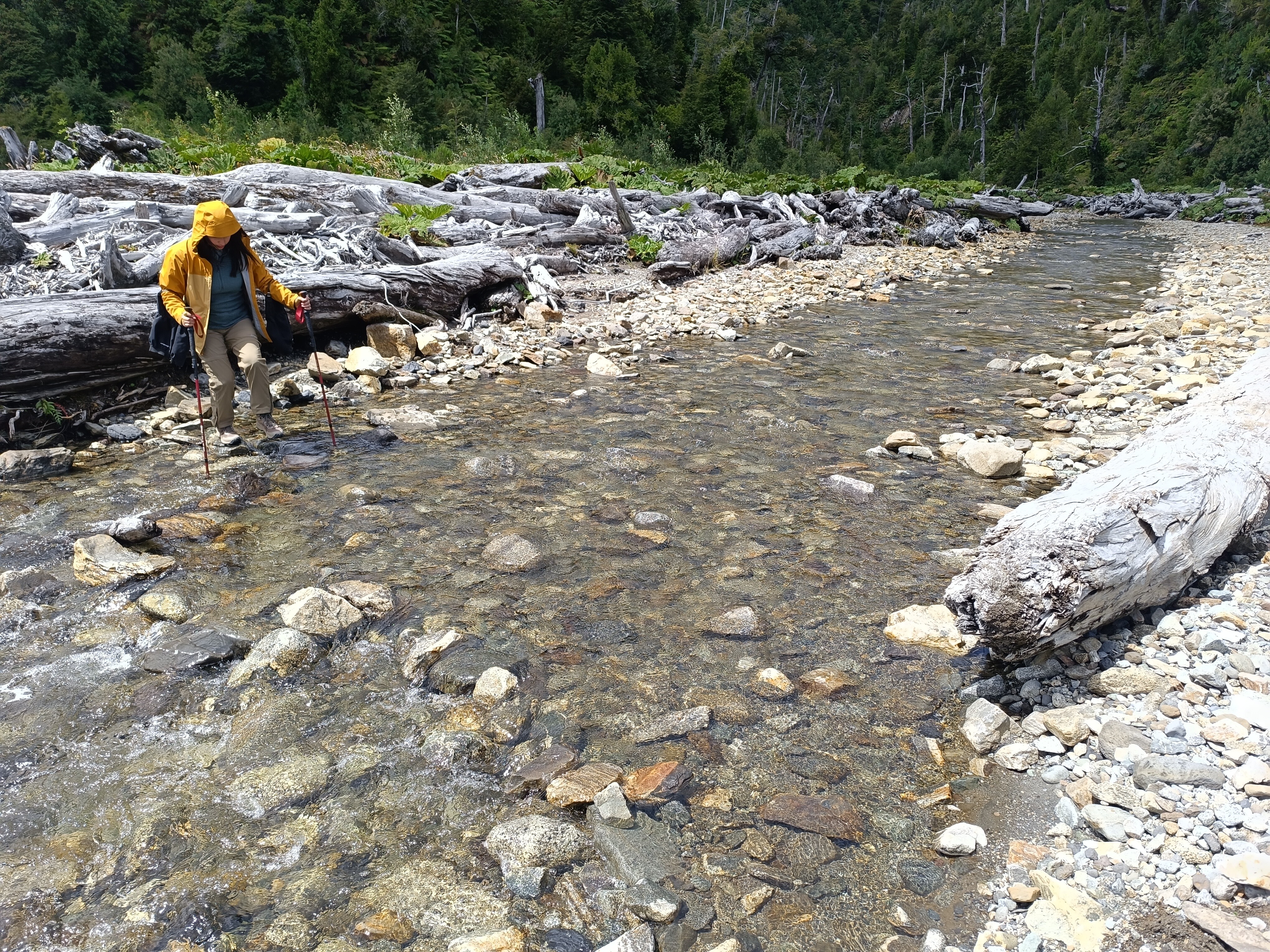 Tras cerca de 1km el sendero sale del bosque y avanza nuevamente unos cuantos metros por un área cubierta de enormes nalcas. Rápidamente se alcanza un pequeño estero (407m) que debe sortearse para continuar avanzando en dirección norte Ver foto 5.